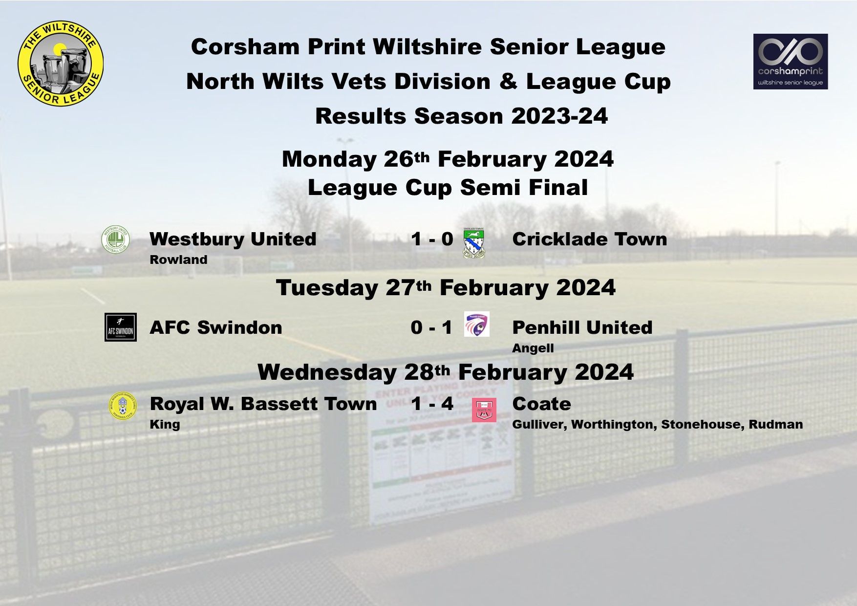 The third Corsham Print Wiltshire Senior League Veterans’ Cup Final will see two new teams contest the final and a new name on the Cup as the winners from Season 2021-22, Cricklade Town from the North Wiltshire Division, were knocked out at the semi-final stage by Mid Wiltshire Division side Westbury United on Monday night. The game was a tight affair decided by a solitary goal scored by Westbury’s Dale Rowland in the first half. Cricklade pushed hard for an equaliser hitting the frame of the goal on several occasions but could not find that elusive equaliser. So, it will be Westbury United who meet Coate in the final scheduled for Friday 19th April at Oakfield Stadium, Melksham. If Cricklade had defeated Westbury it would have meant the same two sides competing for the League Cup and Wiltshire FA County Cup, but that scenario will not now happen as Cricklade’s chances of a treble were ended by their South Wiltshire opponents.