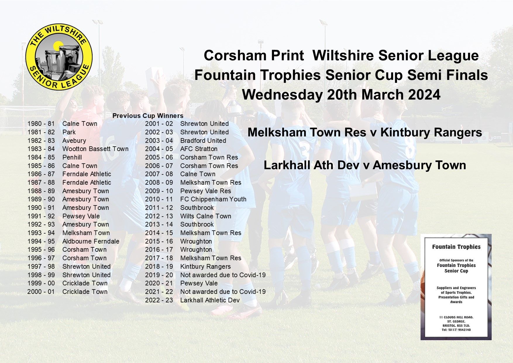 It was a much tighter affair in the league encounter on Saturday where once again the hard work of the Amesbury ground staff allowed the game to be played despite more heavy rain at the latter end of last week. Amesbury went in front in the first half, Josh Moore once again inflicting the damage on Melksham with his 28th of the season. It remained just the one goal until deep into injury time at the end of the game when Melksham were awarded a penalty. Aron Byfield held his nerve to put the spot kick away to give his side a share of the points. Despite the two dropped points Amesbury sit comfortably clear at the top of the table, eight points clear of Kintbury Rangers who have just one game in hand. Both Amesbury and Melksham are back in action this coming midweek with the semi-finals in the Fountain Trophies Cup, both games set to take place on Wednesday evening when Amesbury travel to Larkhall Athletic Development and Melksham Town Reserves entertain Kintbury Rangers for a place in the final. All four semi finalists have previously won the cup. Amesbury Town have won it on four occasions, with their last success coming back in 1992-93. Melksham Town Reserves have lifted the cup on three occasions, with their last victory coming in Season 2014-15. Both Kintbury Rangers and Larkhall Athletic Development have won the cup once, Kintbury's sucess coming in 2018-19 whilst Larkhall Athletic Development are the current holders having won the cup as a Division One side last May defeating Devizes Town in the final.