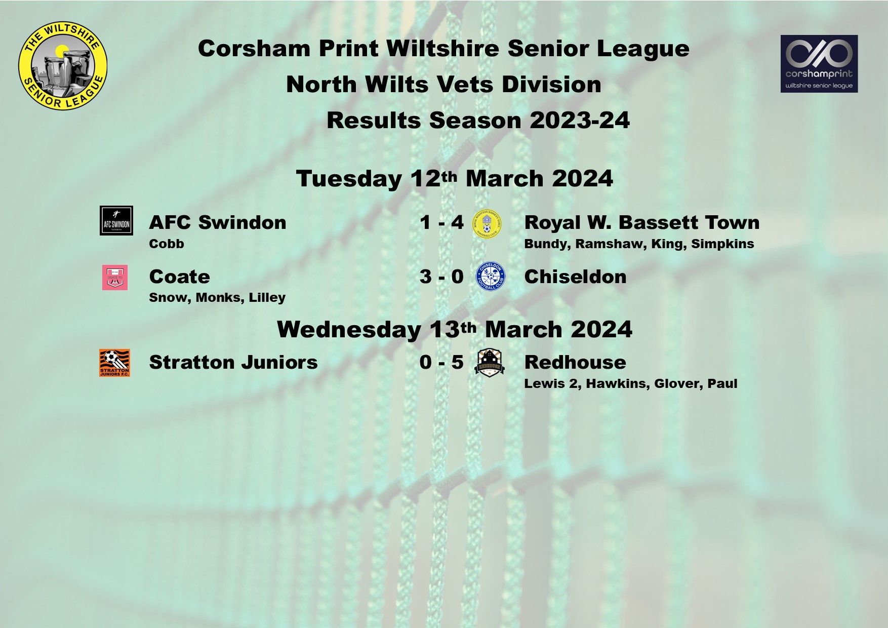 The other game played in the North Wiltshire Division was at Green Lane, Devizes on Tuesday night with AFC Swindon up against Royal Wootton Bassett Town. Goals from David Bundy, Dean Ramshaw, Mark Simpkins and Mark King ensured the points went the way of Royal Wootton Bassett Town, Jason Cobb replying for AFC Swindon as it finished 4-1. Royal Wootton Bassett Town moved up one place in the table as a result of the win, moving above Chiseldon on goal difference.