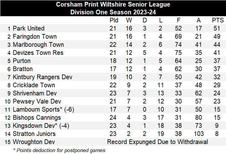 Those dropped points by Faringdon meant Park United returned to the top of the table courtesy of a hard fought 4-2 win over third placed Marlborough Town. Two goals from Lewis McCarron plus one from Zac Hillier and Jamie Norman did the damage for the new leaders, both Marlborough Town goals being scored by Harry Womersley who moved his total onto eleven for the season. Park United head the table by two points with five games to go. Those five games include a couple of tough looking fixtures against Devizes Town Reserves and Bratton and the title race is likely to go right down to the wire. Your Sport Swindon were at Marlborough with their cameras and subscribers can view the highlights by clicking on the link below or the link on the Your Sport Swindon page of the League website where other games covered by Your Sport Swindon can be accessed. See bottom of page for details of how to subscribe to Your Sport Swindon.