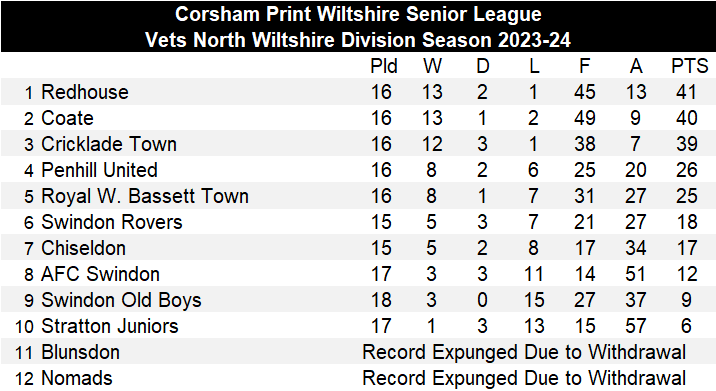 Due to the Easter school holidays there has been limited action across the two Veterans’ Divisions of the Corsham Print Wiltshire Senior League in the past fortnight with just four games played, two in each of the divisions.
