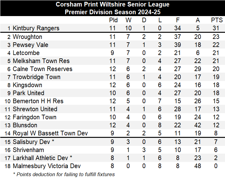 Calne Town Reserves are the in-form team in the division, and they extended their unbeaten run to six games, five of which have been won, with a comprehensive 5-0 victory over near neighbours Royal Wootton Bassett Town Development. There was a hat-trick for Jack Smith who took his tally for the season to eleven, Harry Stiles and Edward Summers with their first goals of the campaign with the other two Calne goals. The latest victory saw Calne climb a place in the table to sixth spot.