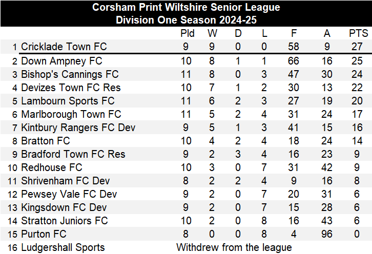 The one game on Saturday saw Down Ampney move up to second place in the table with a 3-1 home win over Lambourn Sports. Leadings scorer Charlie McCuish added two more to his tally for the season to move onto 16, with Lewis Baston getting the other Down Ampney goal, Jamie Stones with the reply for Lambourn Sports.