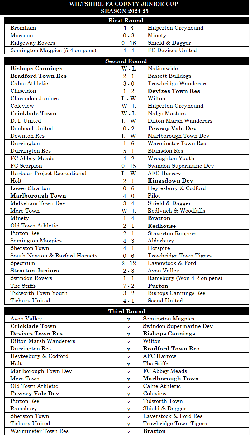 Bratton find themselves on the road again with an away tie against Warminster Town Reserves from the Trowbridge & District League. The full results to date and the draw for the Third Round is shown below: