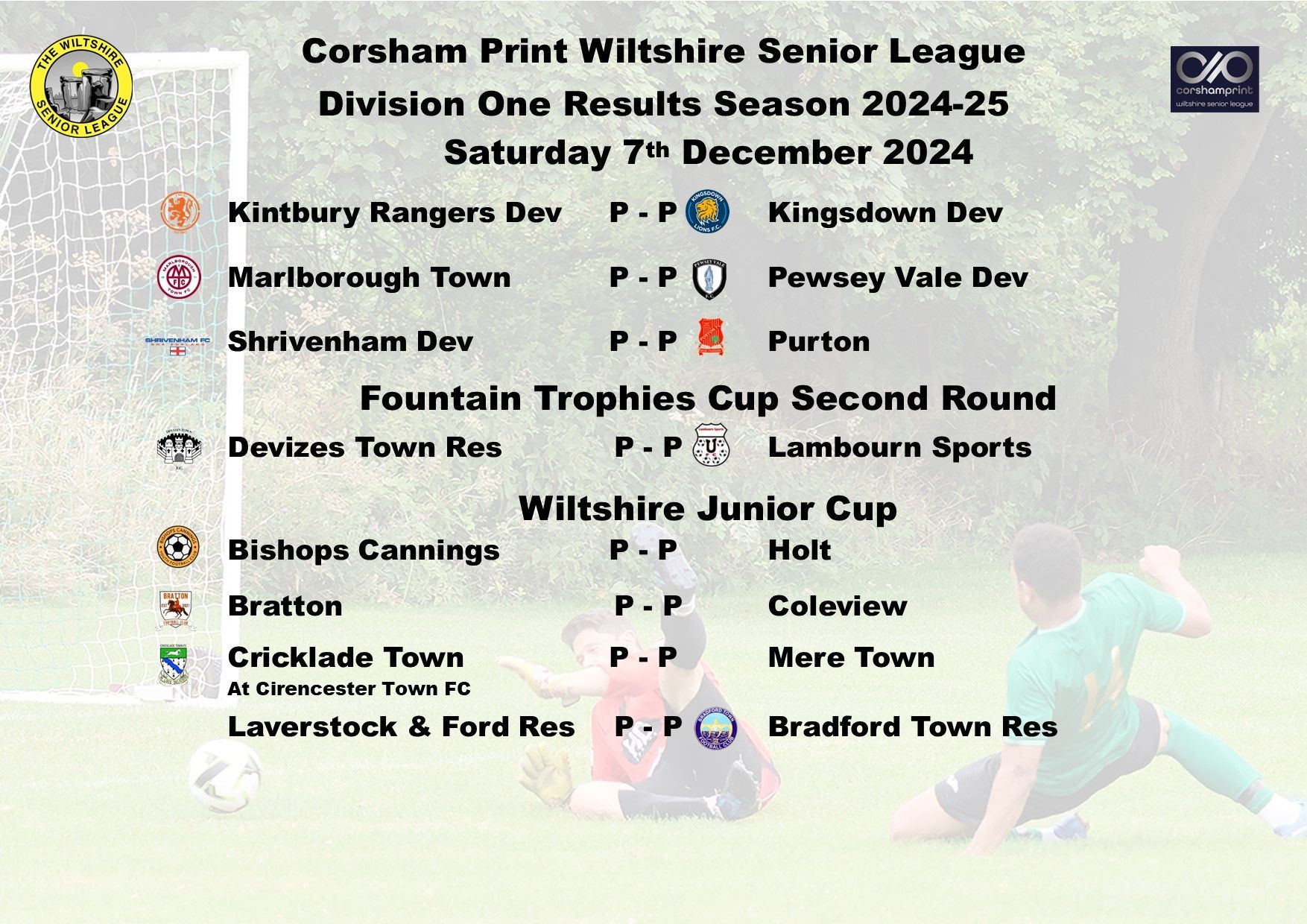 As noted above all games in Division One, the one game in the Fountain Trophies Cup and the Wiltshire Junior Cup were all postponed due to the weather conditions. The game between Shrivenham Dev and Purton was the closest game to getting played but in the end fell victim to a waterlogged pitch at midday, despite the efforts of the Shrivenham club to get the game on. Again, as noted above, next week's fixtures in the Division will be impacted by postponements in the Wiltshire Junior Cup and the fixtures shown below have been adjusted for rearranged games postponed on 7th December.