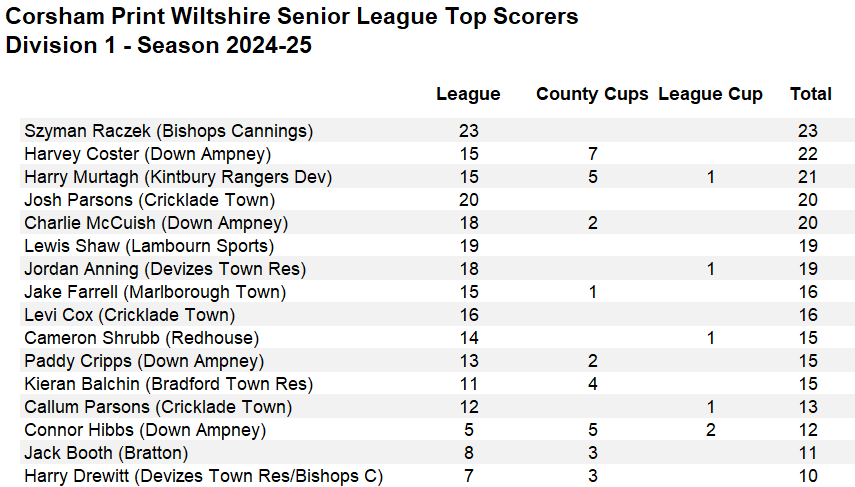 With rearranged County Cup fixtures there were just four league games in Division One of the Corsham Print Wiltshire Senior League. With second placed Down Ampney and Bishops Cannings in third spot both in County Cup action, and with their own County Cup game having been rescheduled by the Wilts FA for next week, Cricklade Town had the chance to increase their lead at the top of the table when they entertained Kintbury Rangers Development. In a tight first half the league leaders led 2-1 at the break but stepped it up after the interval to score three more unanswered goals to run out 5-1 winners and go 11 points clear at the top of the table. Whilst it looks a healthy lead at this stage of the season, Down Ampney have three games in hand and would move to within two points of the leaders if they won all three games. On target for Cricklade were Levi Cox, Harry Ayres, Chris Jackson, Emmanuel Kwarteng-Abrokwa and Josh Coombe, Alfie Davis-Ellard with that first half Kintbury goal.