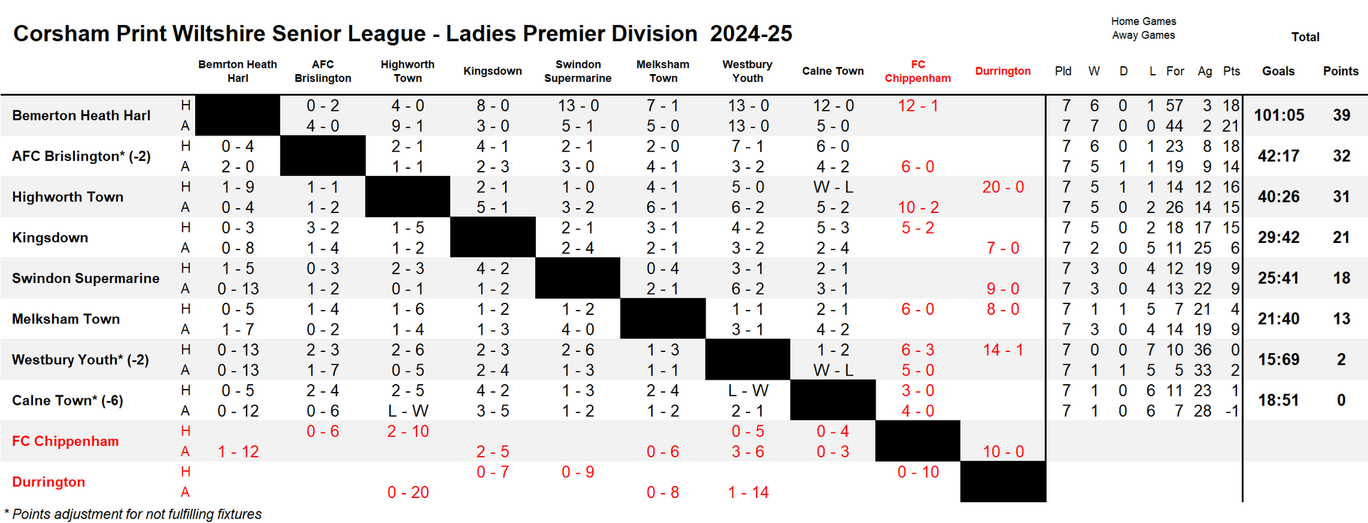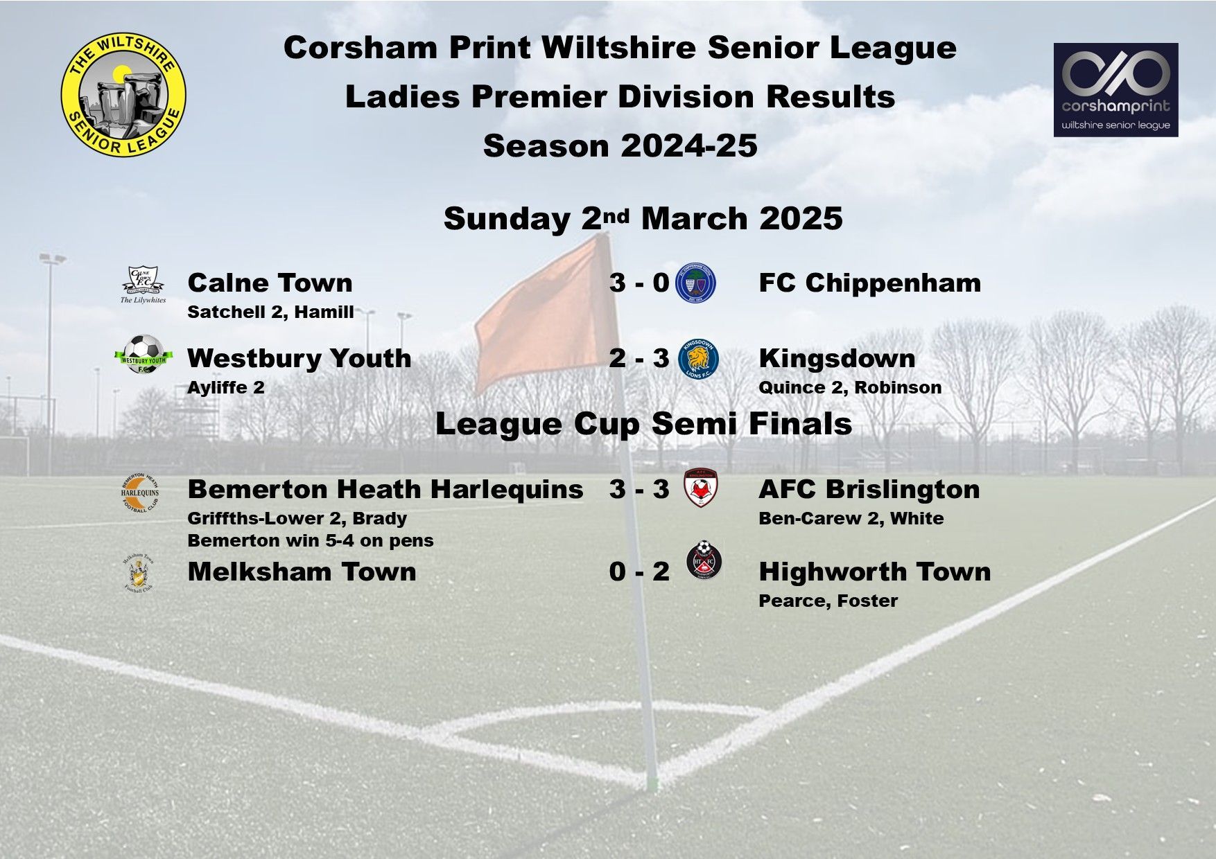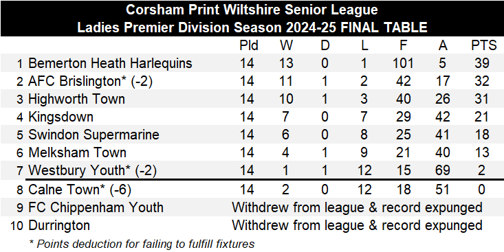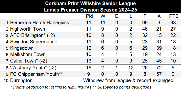 There were just three games played this weekend in the Ladies Premier Division of the Corsham Print Wiltshire Senior League with FC Chippenham calling off for the sixth time this season due to being unable to raise a side and they have now made the decision to withdraw from the league with immediate effect. In due course their record is expected to be expunged due to the side not having played 75% of their games although the matter still needs to be discussed at the next Discipline Meeting.