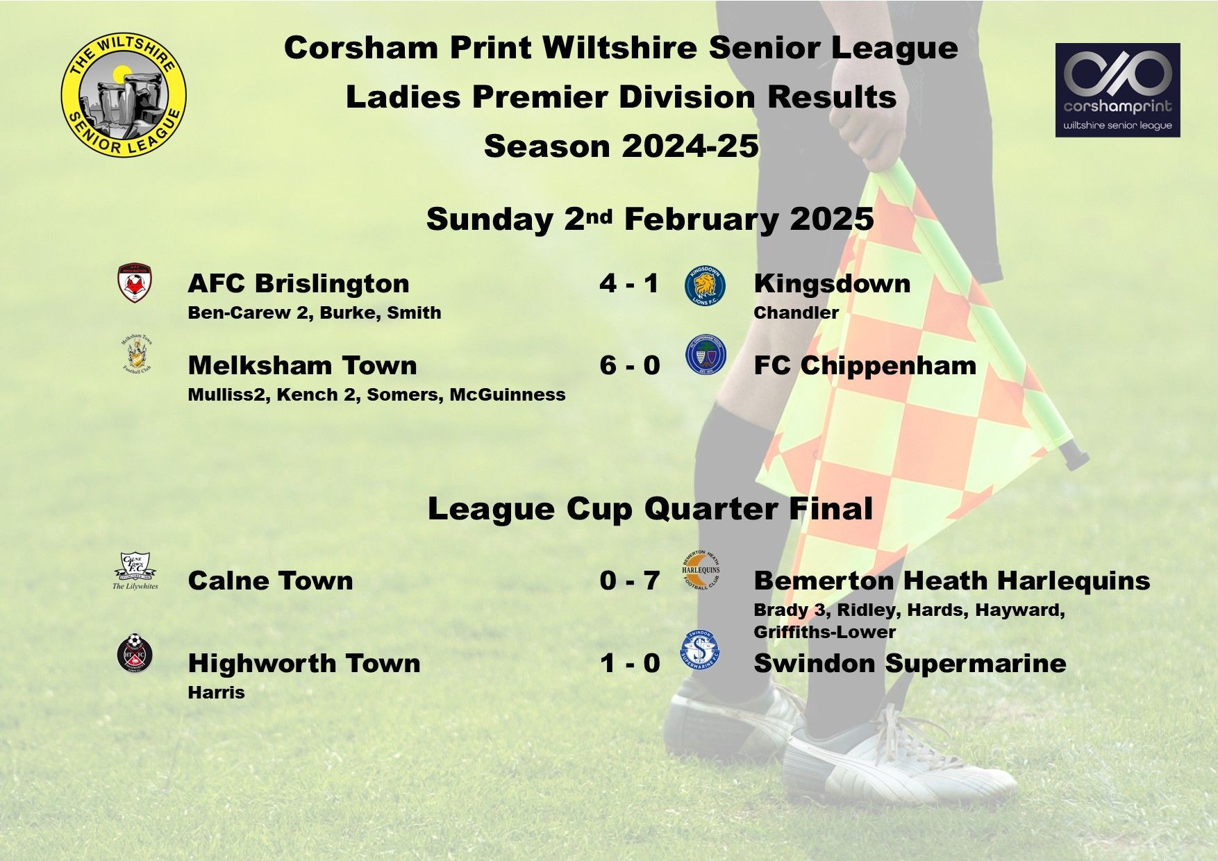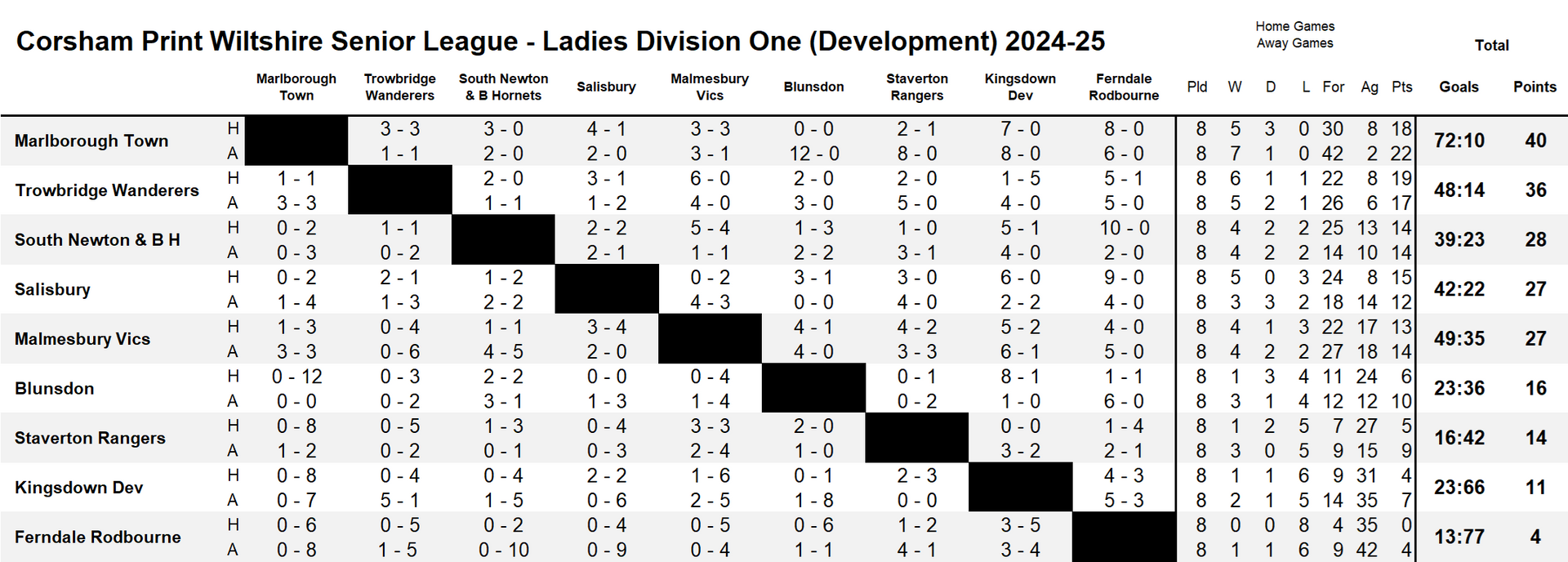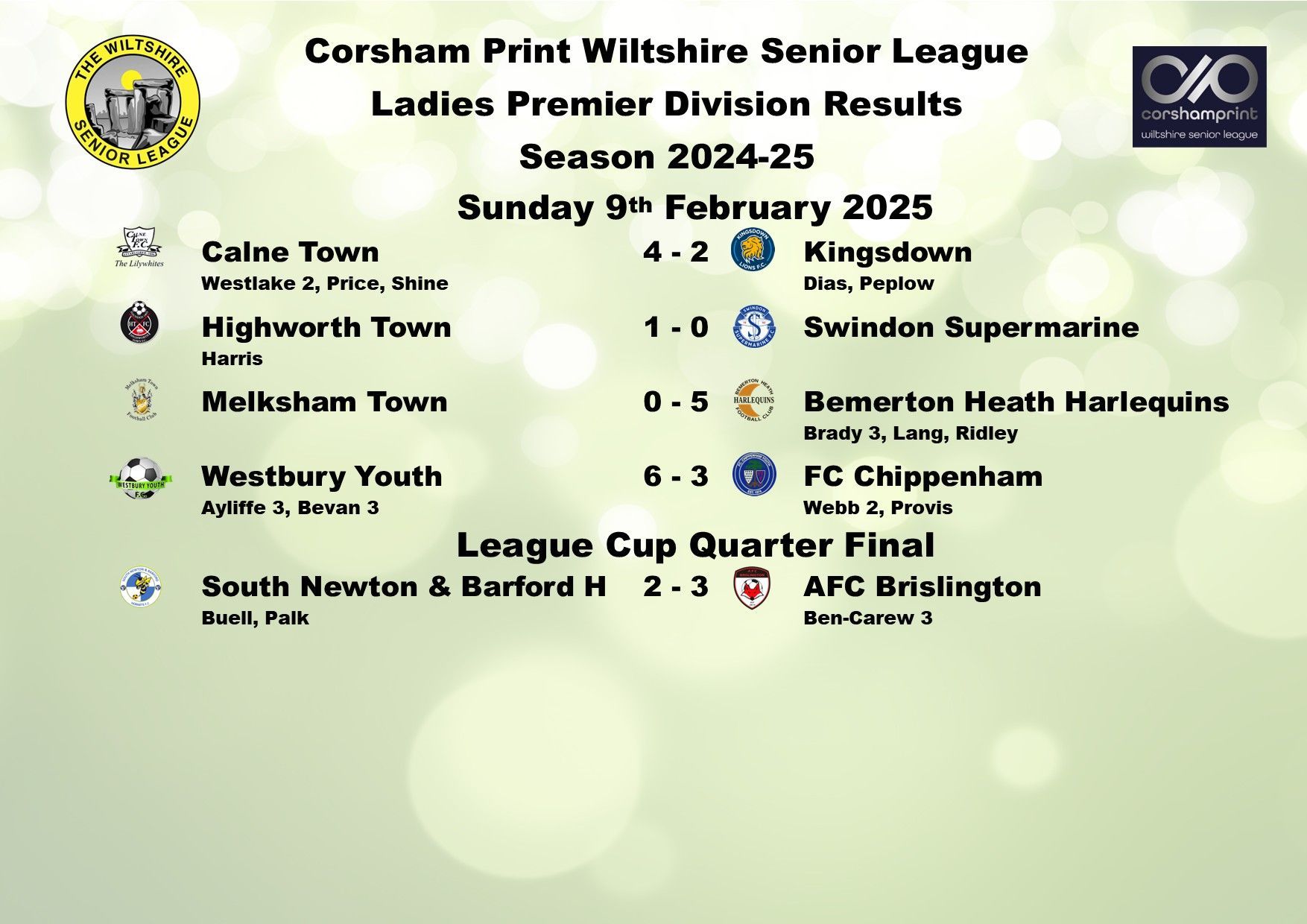 There were just three games played this weekend in the Ladies Premier Division of the Corsham Print Wiltshire Senior League with FC Chippenham calling off for the sixth time this season due to being unable to raise a side and they have now made the decision to withdraw from the league with immediate effect. In due course their record is expected to be expunged due to the side not having played 75% of their games although the matter still needs to be discussed at the next Discipline Meeting.