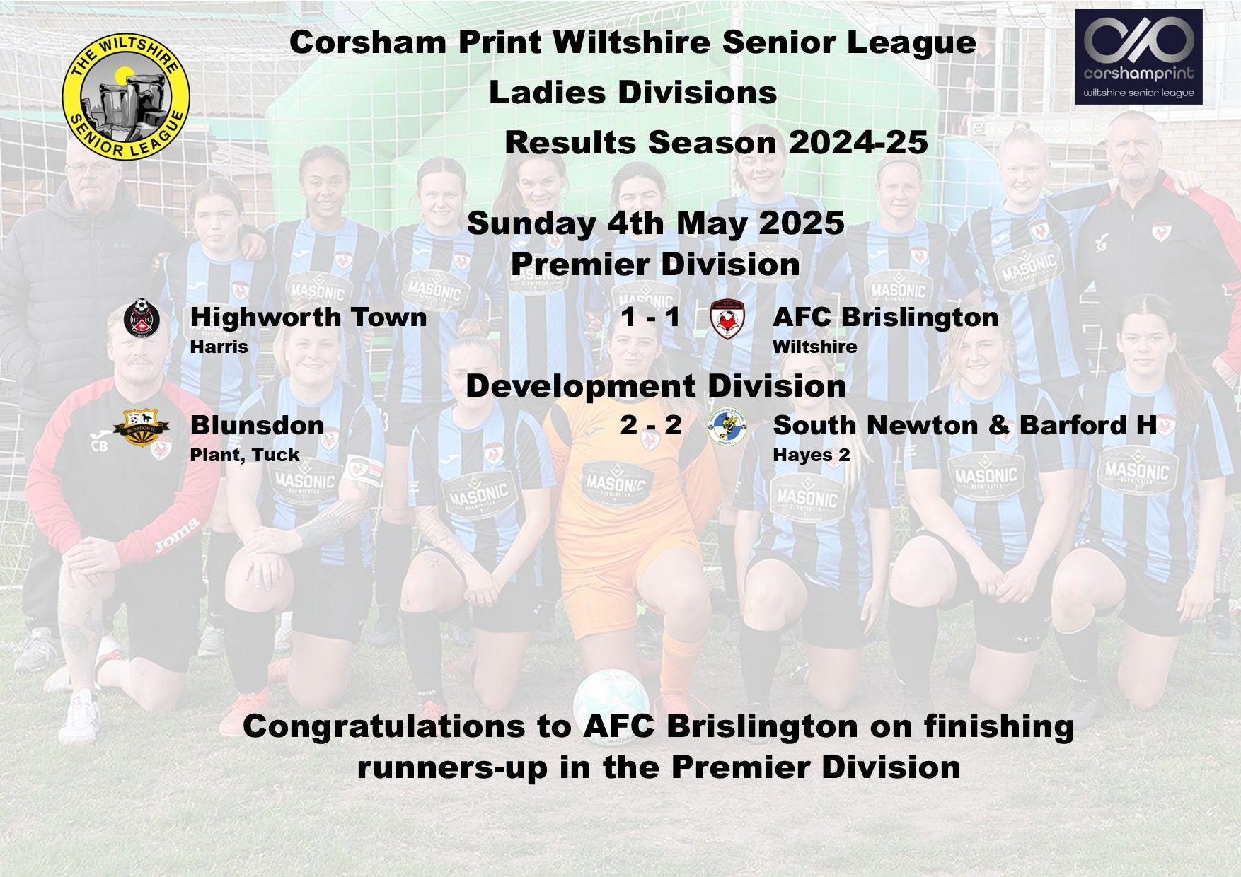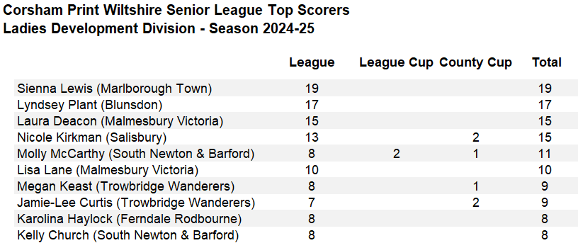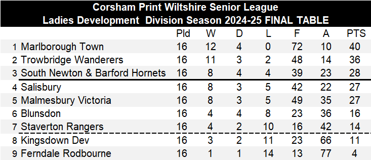 The one outstanding game in the Development Division, which is set to be re-branded as Division One next season, saw Blunsdon entertain South Newton & Barford Hornets after the Wiltshire FA dismissed Blunsdon's appeal against the re-staging of the game which had been abandoned with Blunsdon leading at the time of the abandonment. It started well for the home side Blunsdon on Sunday as first half goals from leading scorer Lyndsey Plant and Danielle Tuck saw Blunsdon lead 2-0 at the break. However, visitors South Newton & Barford turned things around in the second half, Kaelani Hayes scoring twice to level matters up at 2-2 and give South Newton & Barford a point which was enough to see them secure third spot behind champions Marlborough Town and runners-up Trowbridge Town Wanderers. South Newton & Barford finishing just that one point above both Salisbury and Malmesbury Victoria. It is pleasing to report that all fixtures were played in this division this season.