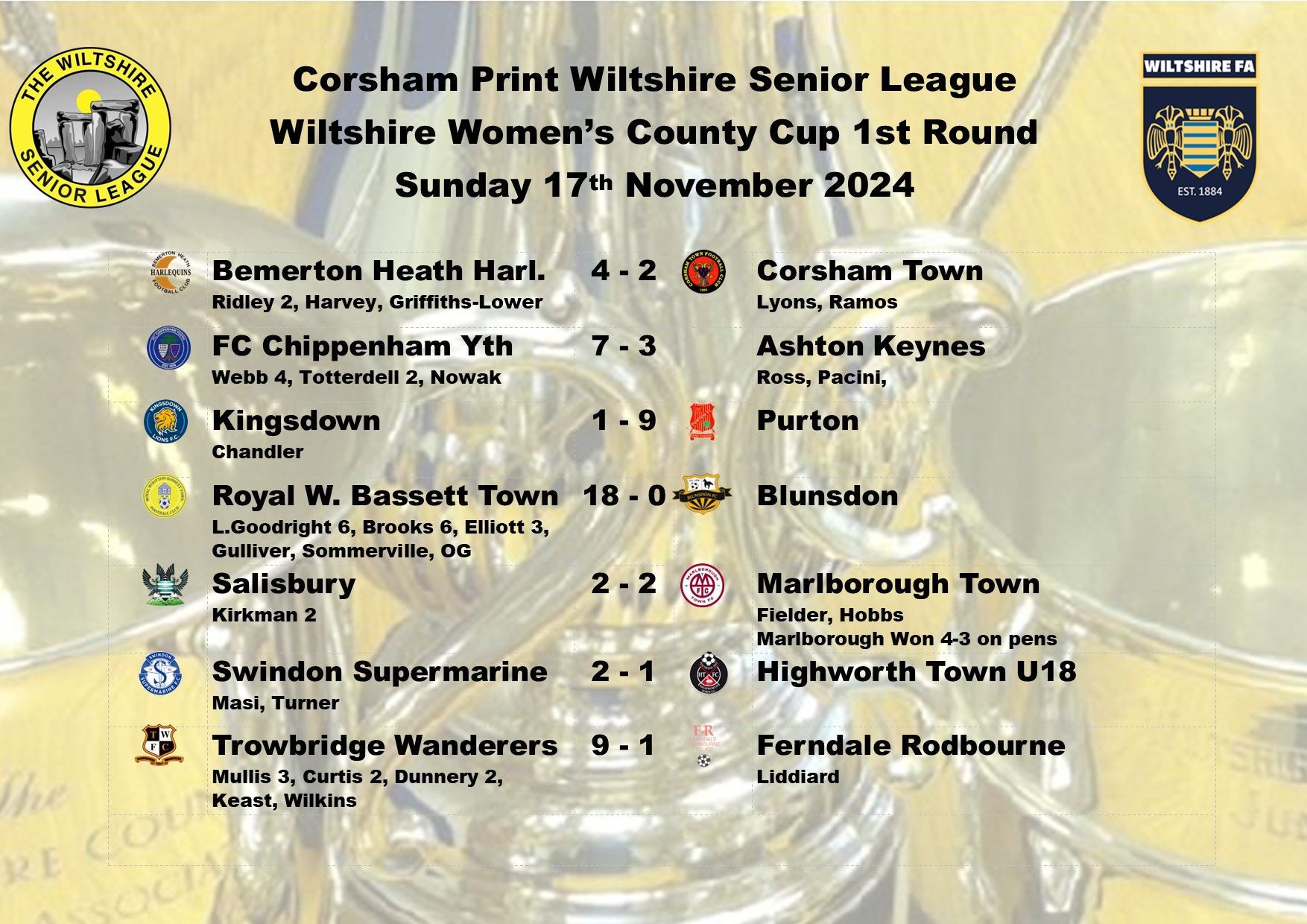 Today sees the first staging of a Corsham Print Wiltshire Senior League Ladies League Cup Final, which is taking place at the Sustain Stadium, home of Royal Wootton Bassett Town. Thank you to Royal Wootton Bassett Town for hosting this final, which is our first ever final to be held at this ground. We will also be holding our U18's Floodlight Division final at this venue next month. Hopefully the sides will enjoy playing on what is one of the best playing surfaces in the county.