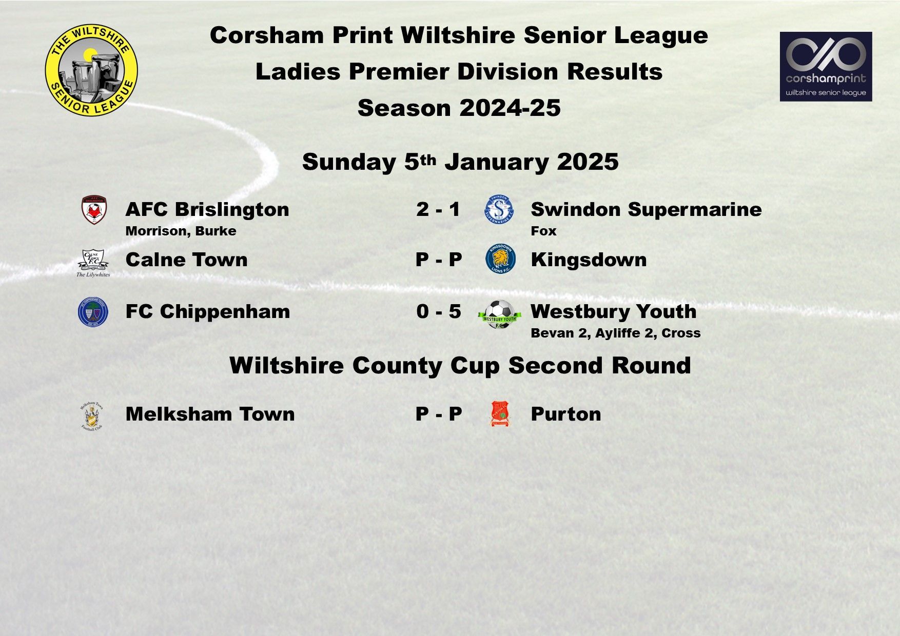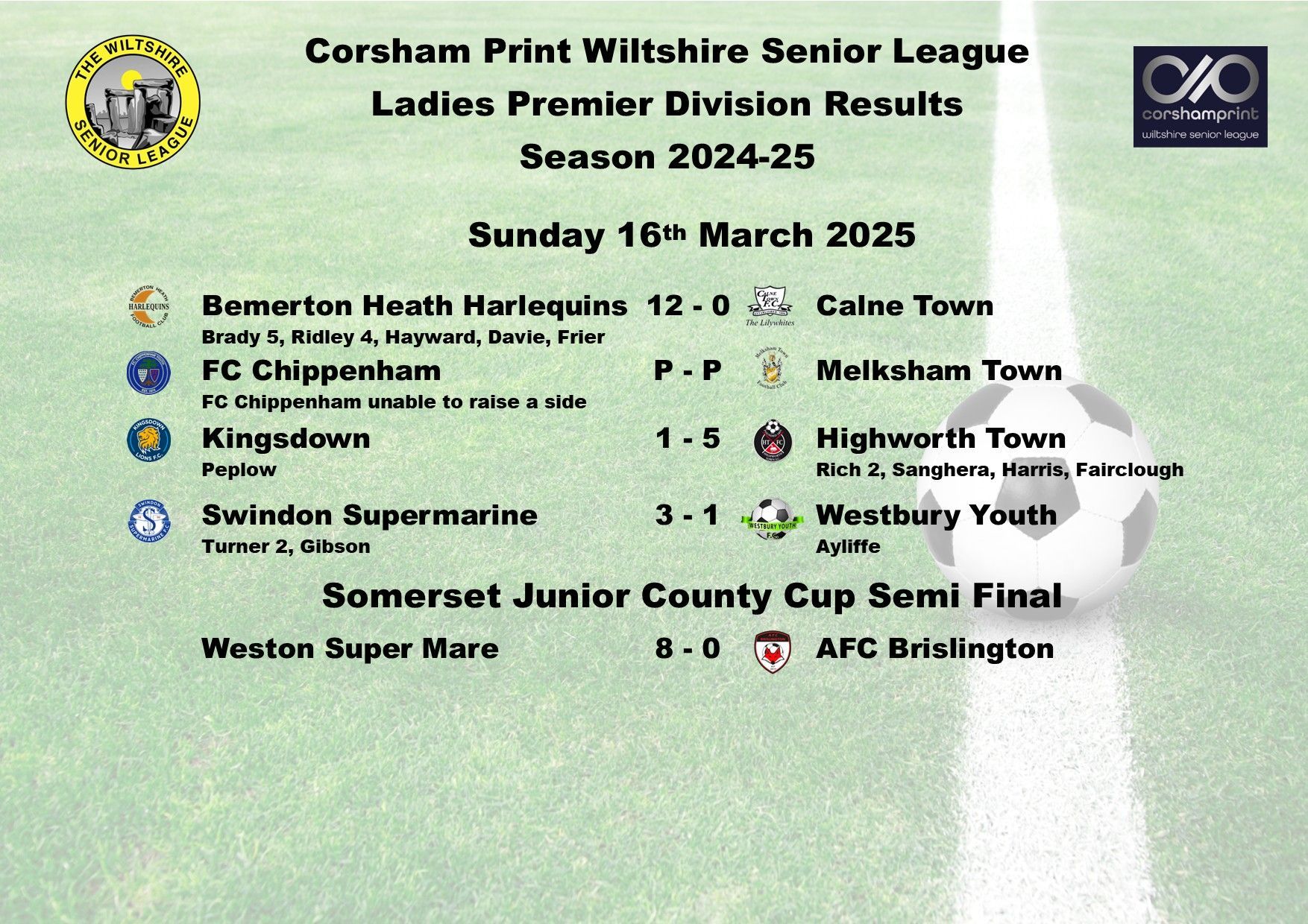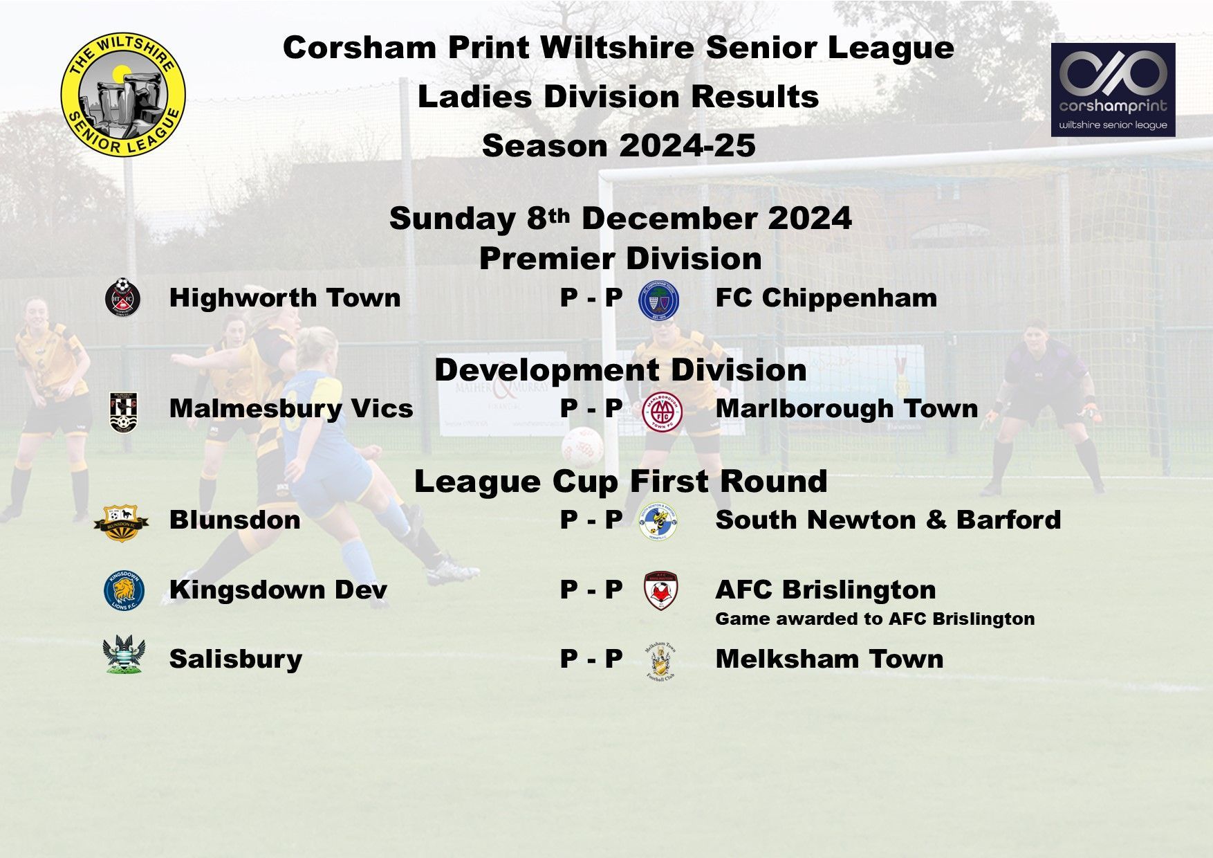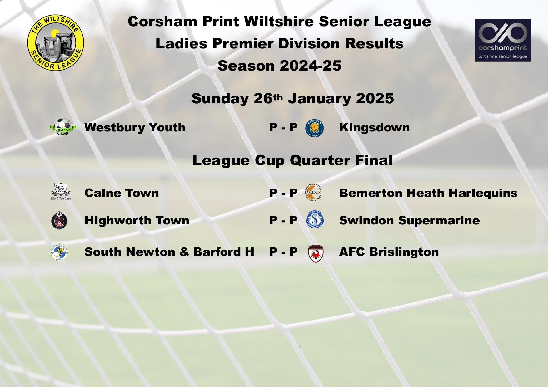 The game between Swindon Supermarine and AFC Brislington was postponed due to a waterlogged pitch and FC Chippenham were unable to raise a side for their trip to Westbury Youth and will become the first Ladies game needing to be discussed at the next League Discipline Meeting.