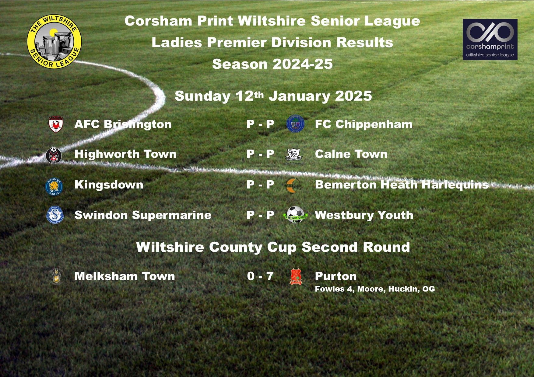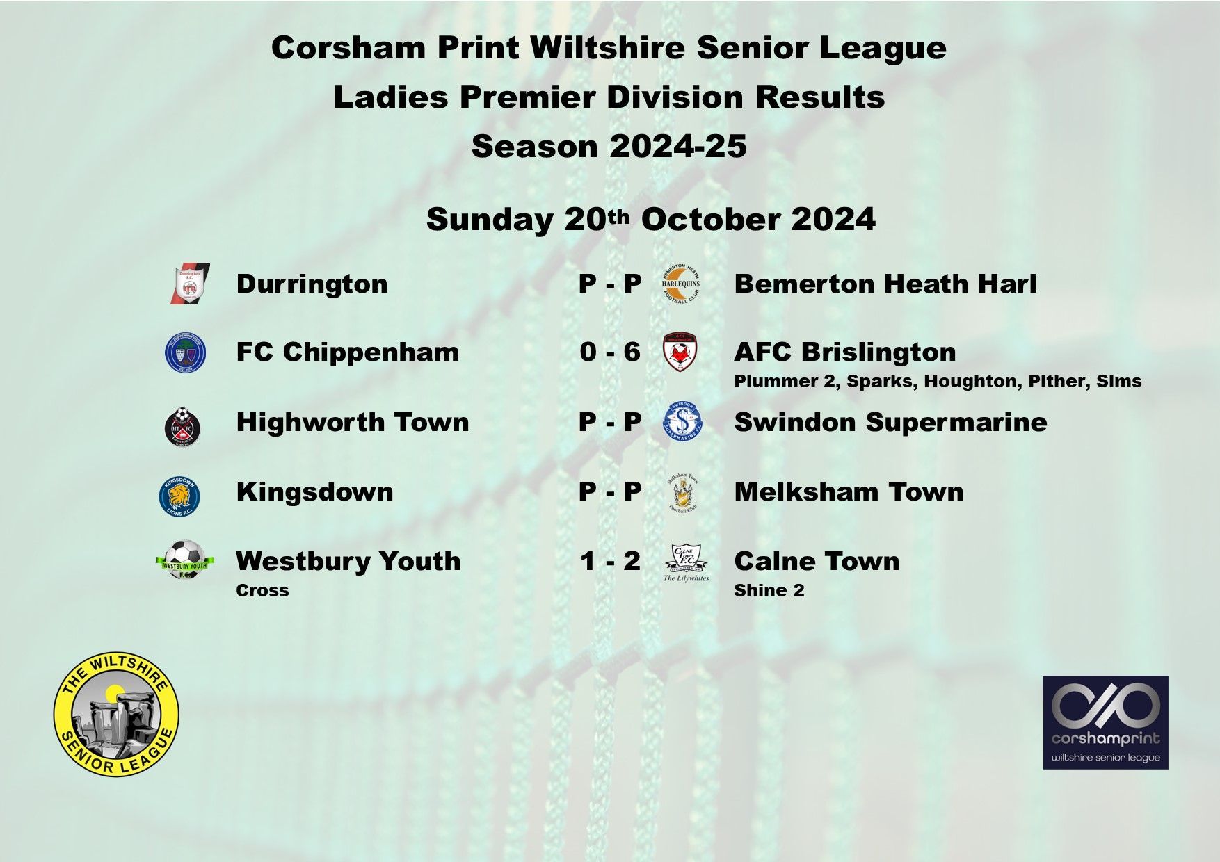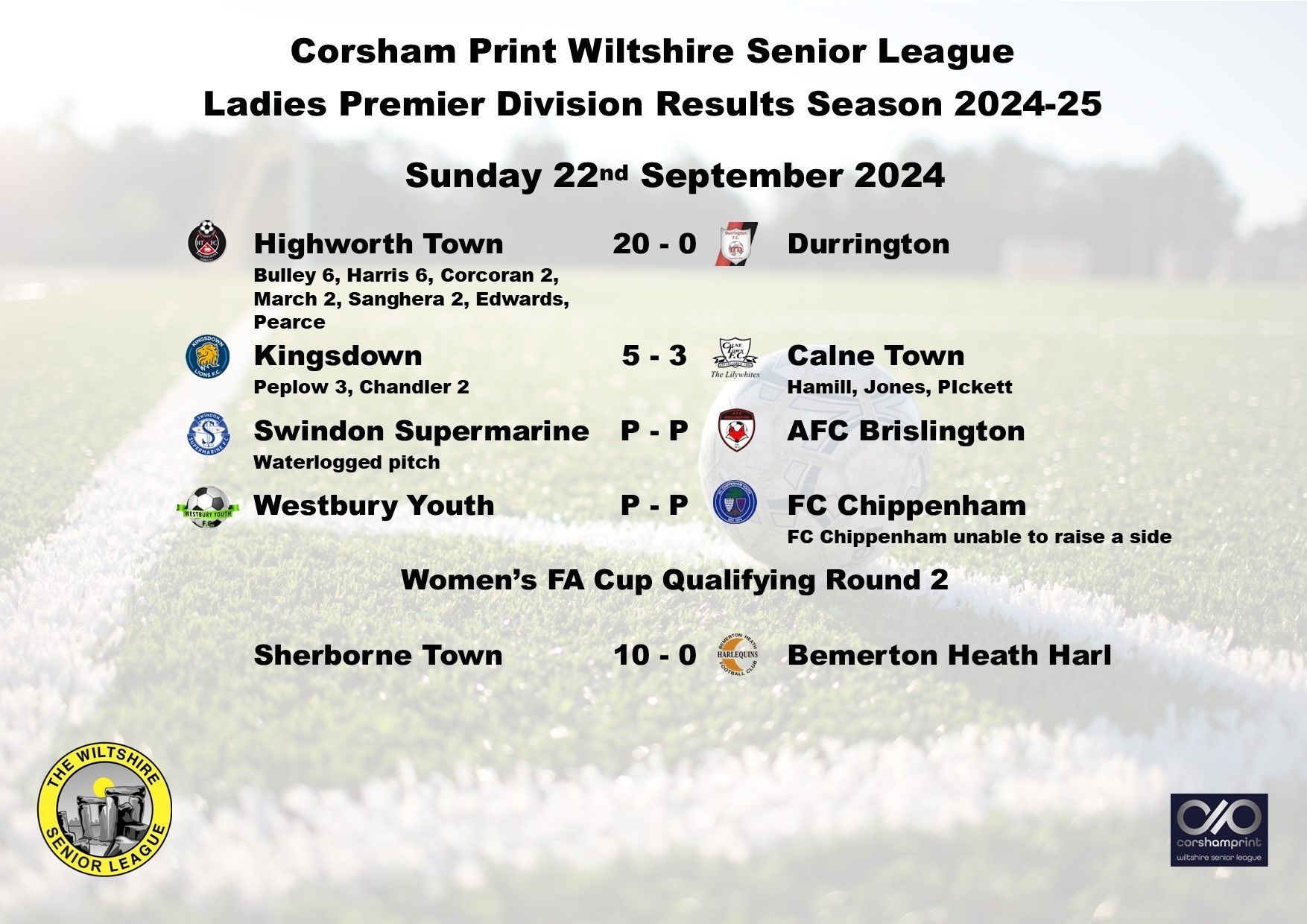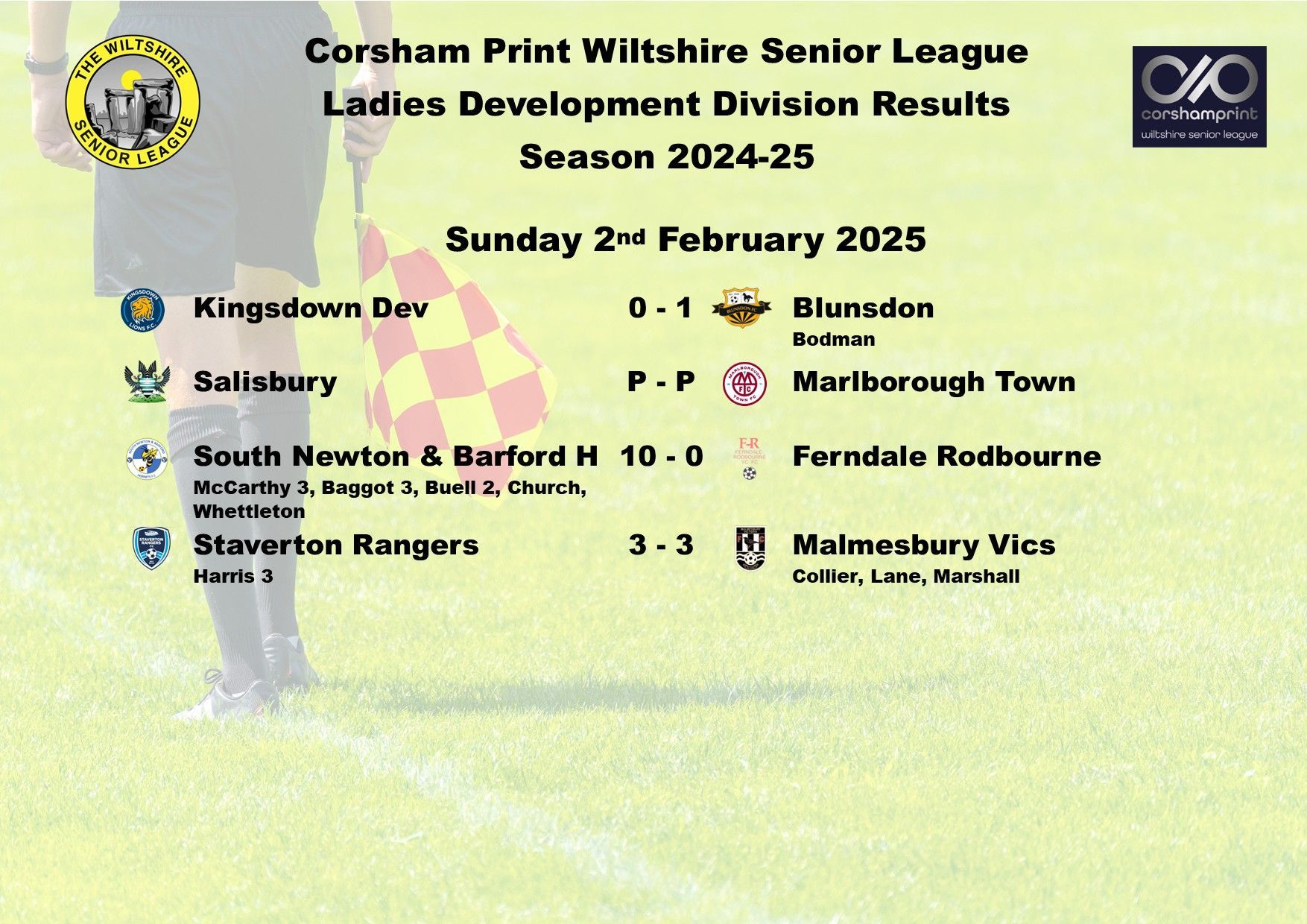The game between Swindon Supermarine and AFC Brislington was postponed due to a waterlogged pitch and FC Chippenham were unable to raise a side for their trip to Westbury Youth and will become the first Ladies game needing to be discussed at the next League Discipline Meeting.