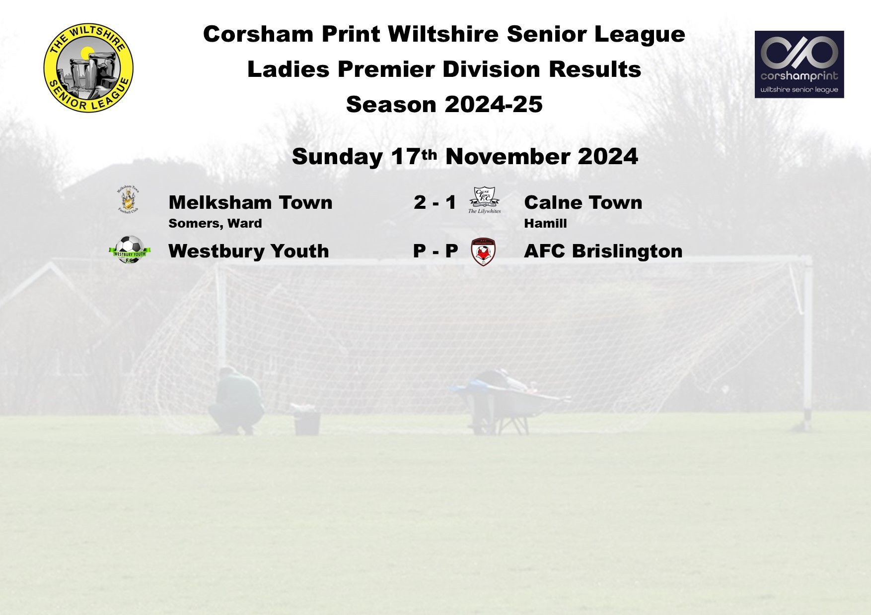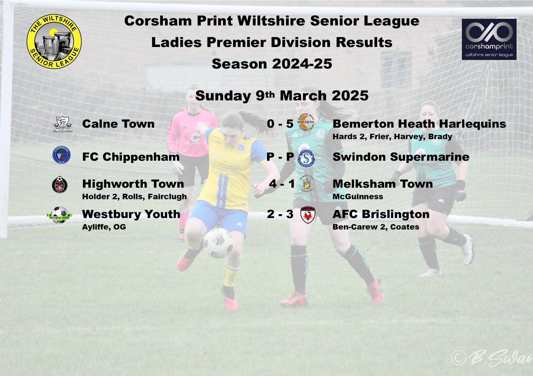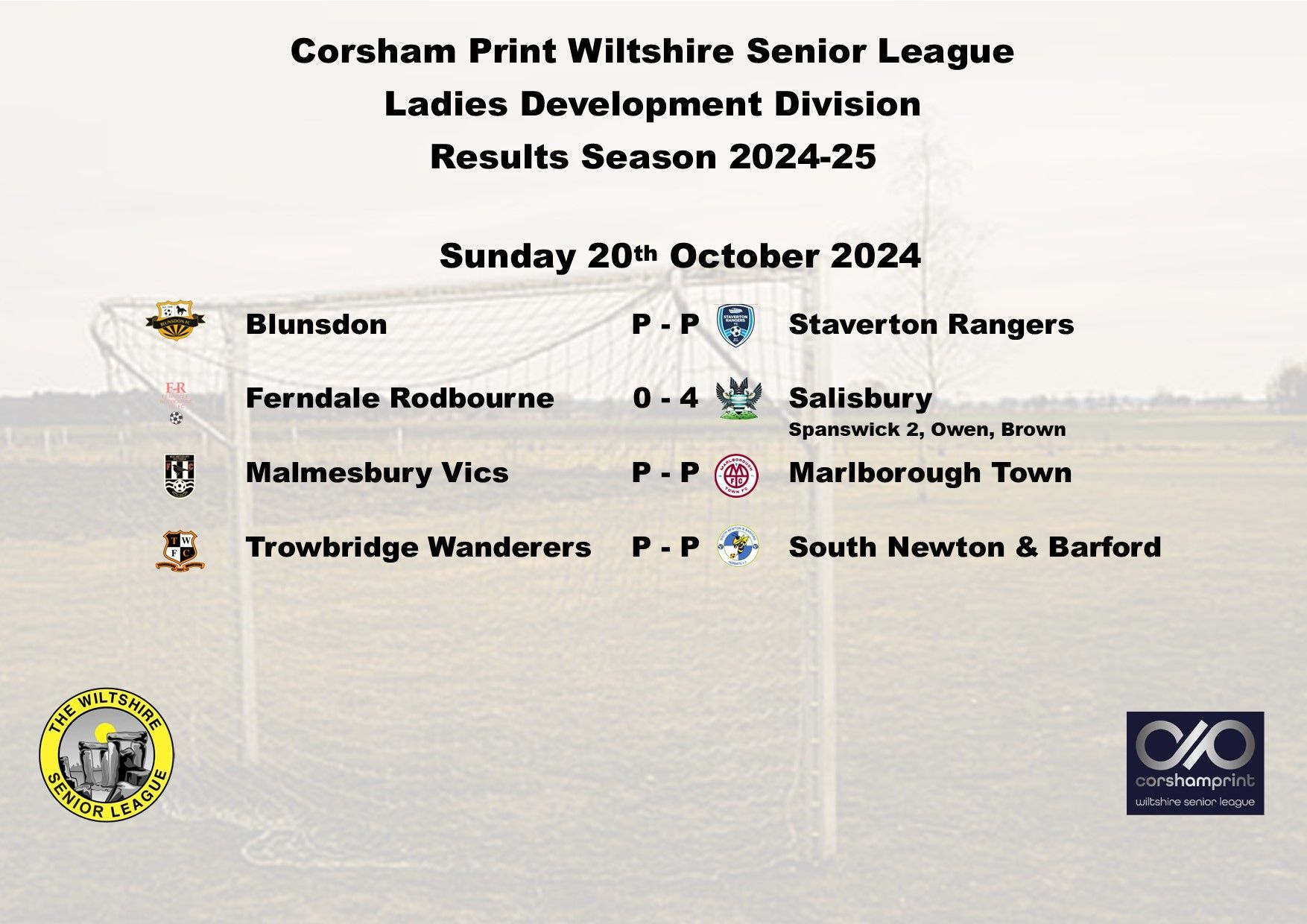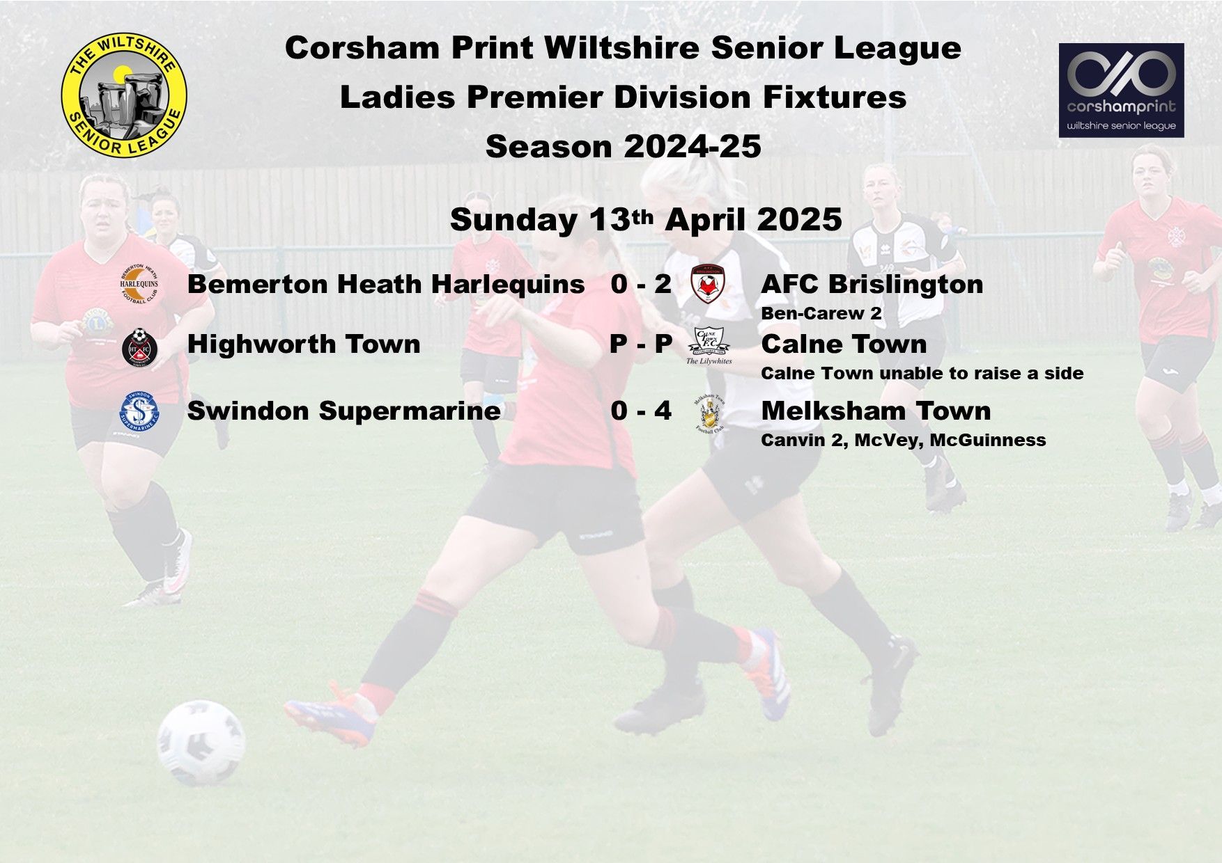 The game between Swindon Supermarine and AFC Brislington was postponed due to a waterlogged pitch and FC Chippenham were unable to raise a side for their trip to Westbury Youth and will become the first Ladies game needing to be discussed at the next League Discipline Meeting.