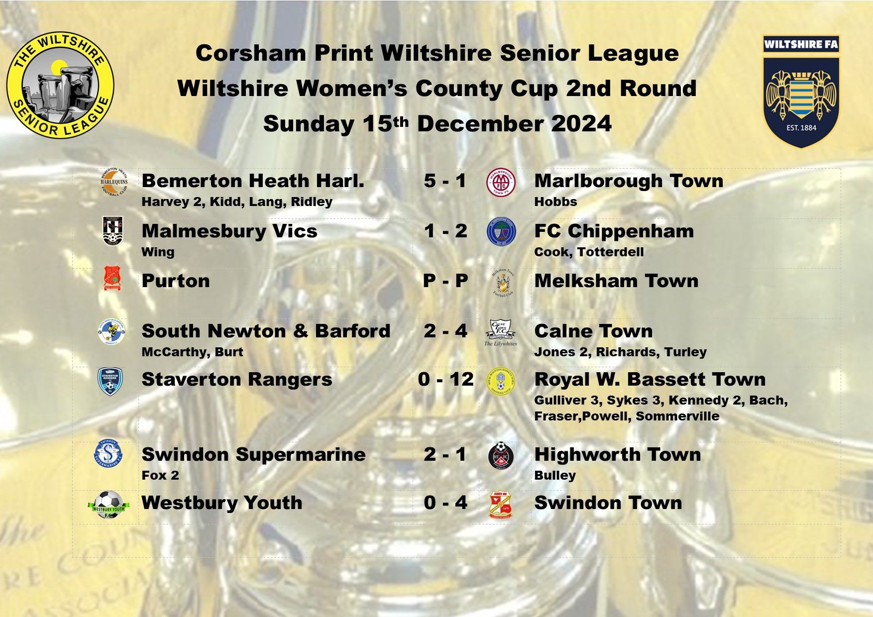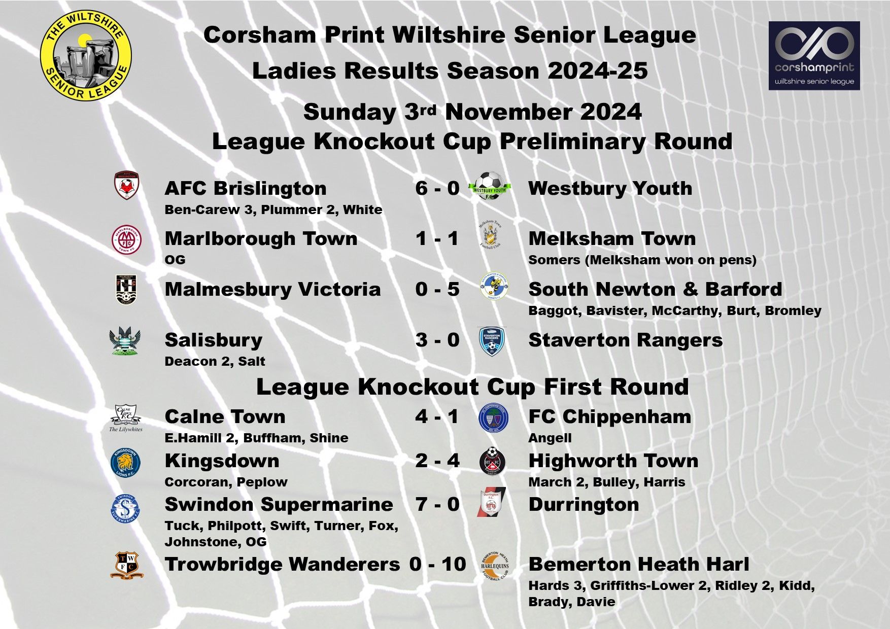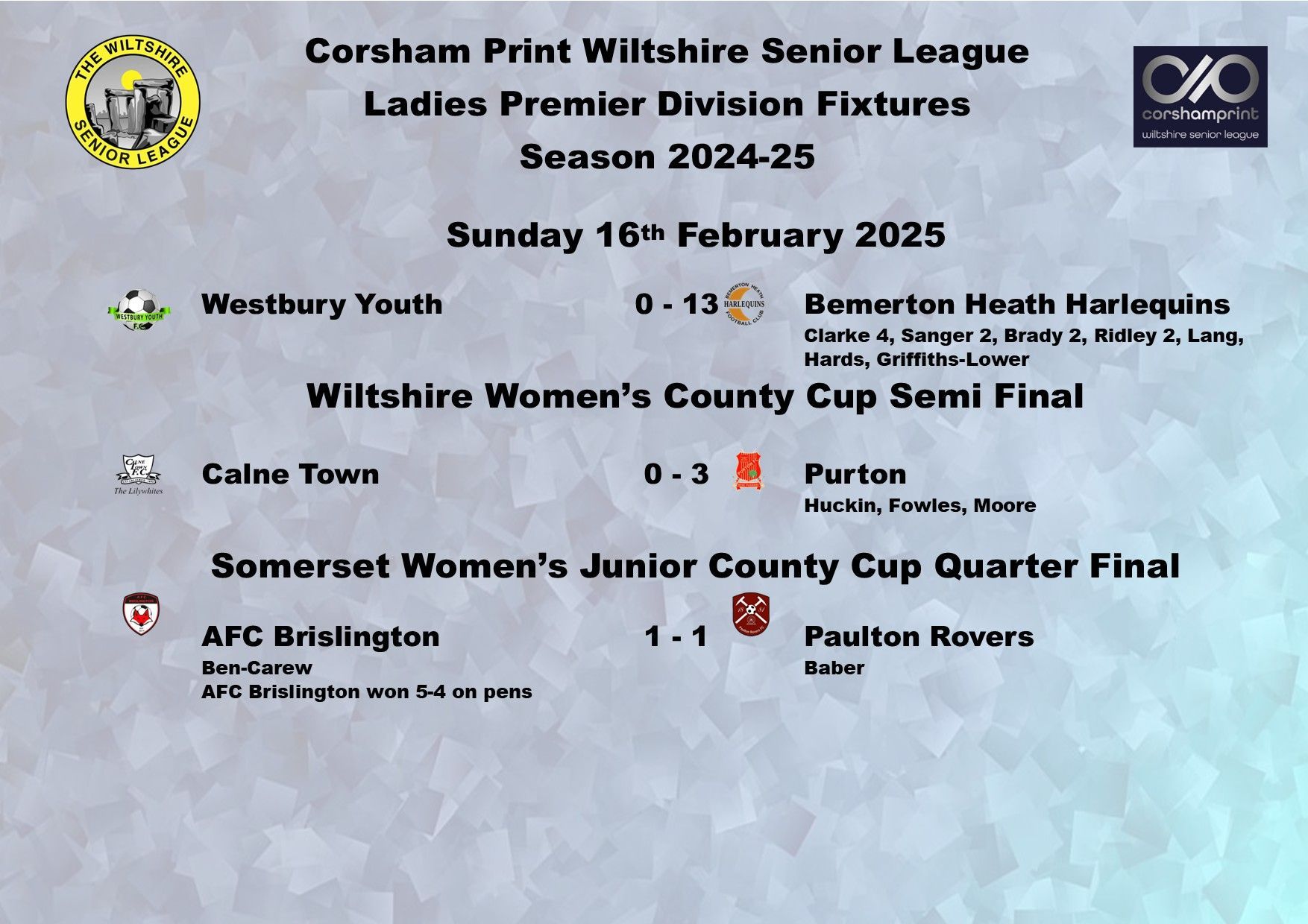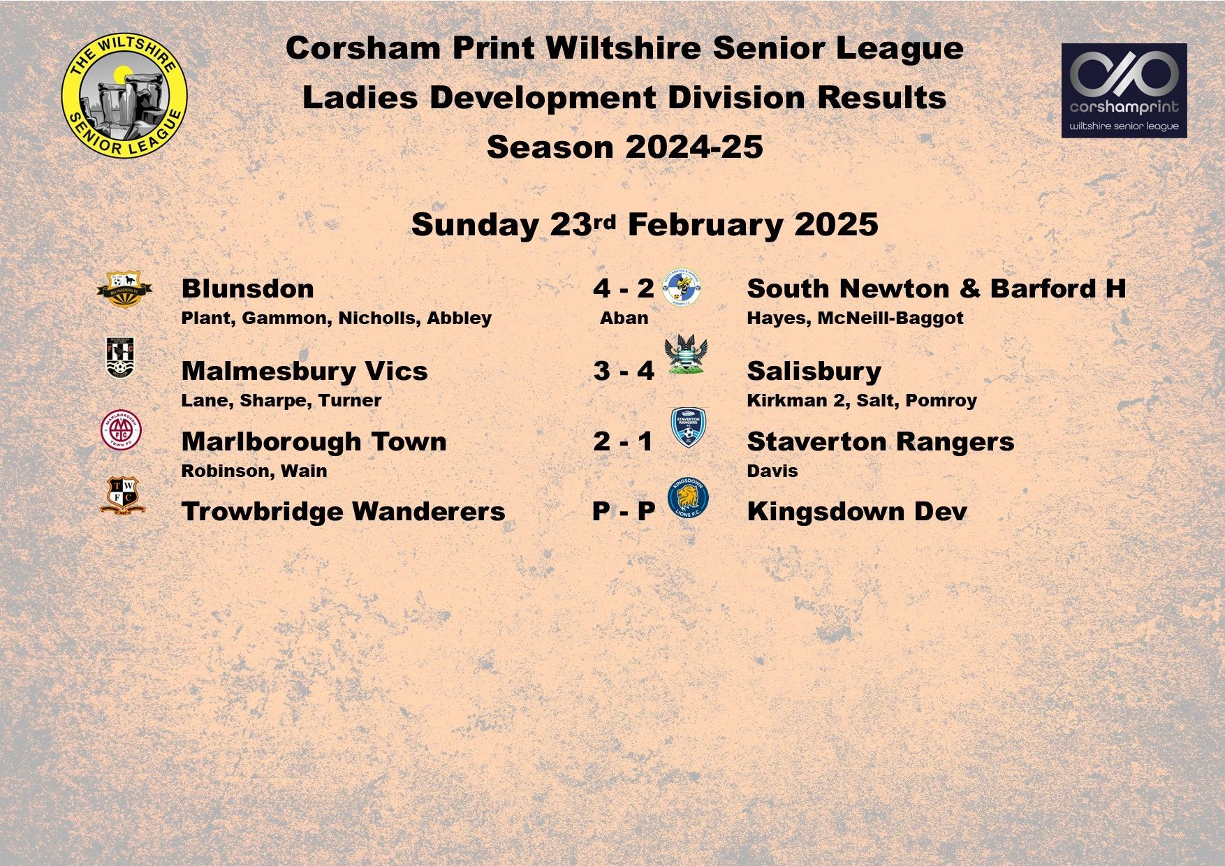 The game between Swindon Supermarine and AFC Brislington was postponed due to a waterlogged pitch and FC Chippenham were unable to raise a side for their trip to Westbury Youth and will become the first Ladies game needing to be discussed at the next League Discipline Meeting.