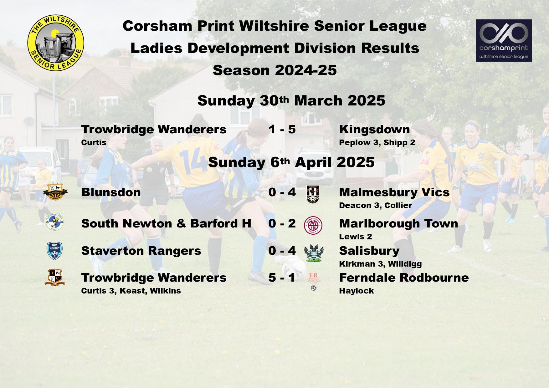 Westbury Youth, Lily Baker scoring for Melksham and Courtney Crockford-Ward for Westbury Youth in the 1-1 draw. The game between Calne Town and Durrington was postponed due to Durrington being unable to raise a side.