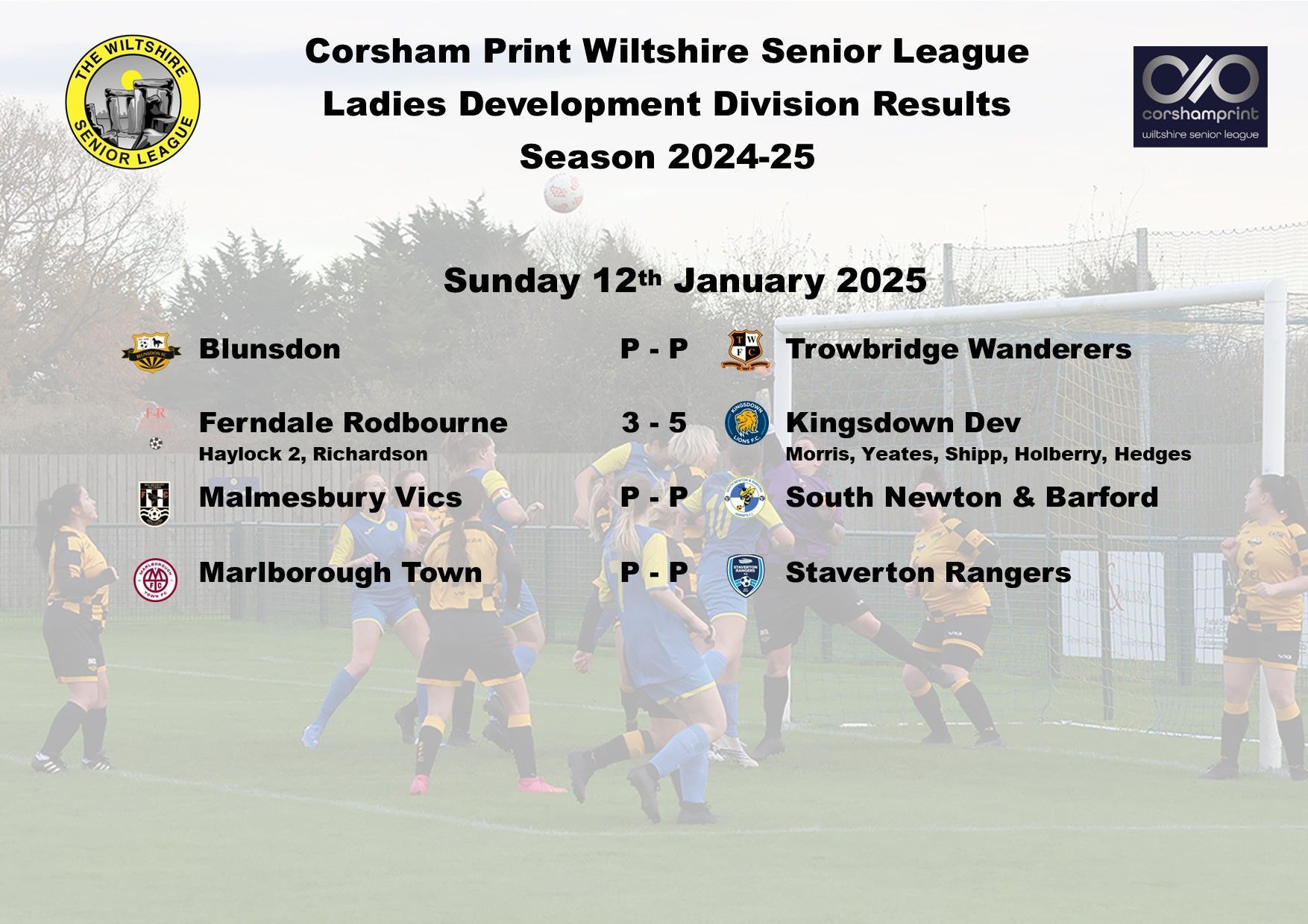 Just three of the four scheduled games in the Ladies Premier Division of the Corsham Print Wiltshire Senior League went ahead last Sunday, with the top three side all securing a win as they continued to dominate the division.