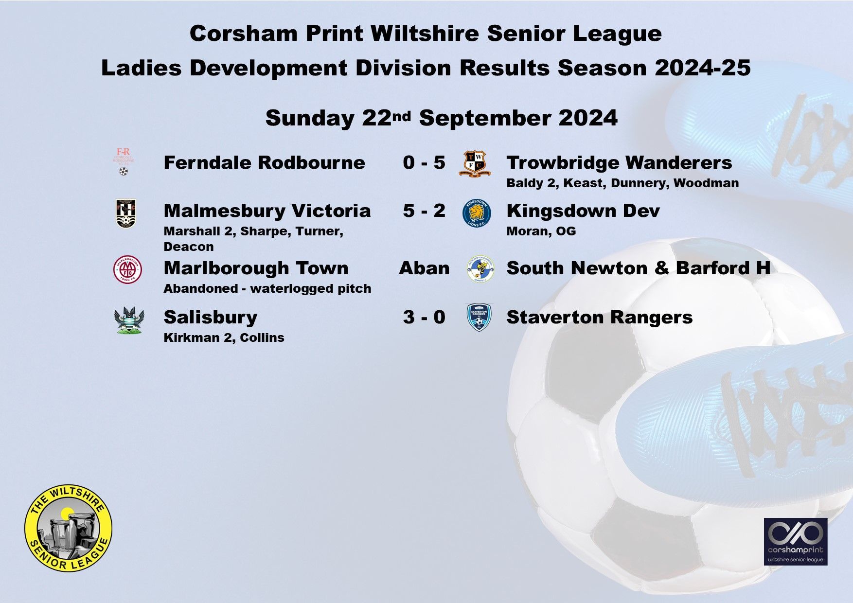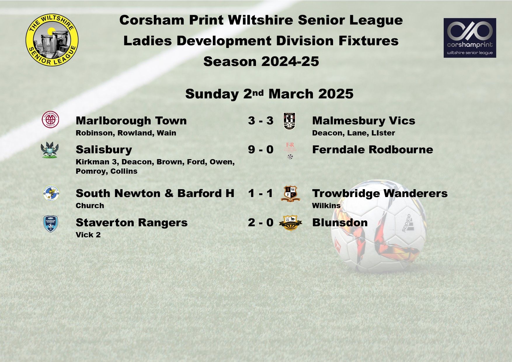 The final game of the day saw fifth placed Malmesbury Victoria move to within a point of Salisbury following a 4-0 home win against bottom of the table Ferndale Rodbourne. Laura Deacon led the way for Malmesbury scoring a hat-trick with Rhianon Stidever getting the other Malmesbury goal.