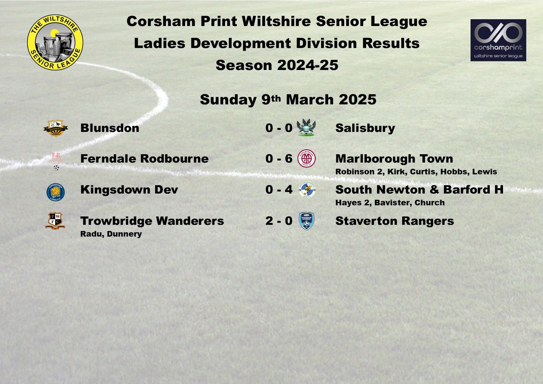 It also finished honours even in the game between third place Trowbridge Wanderers and South Newton & Barford Hornets, the side just below Wanderers in the table. Kelly Church scoring for South Newton & Barford in the 1-1 draw, Erin Wilkins with the goal for Trowbridge Wanderers, both goals coming in the first half.