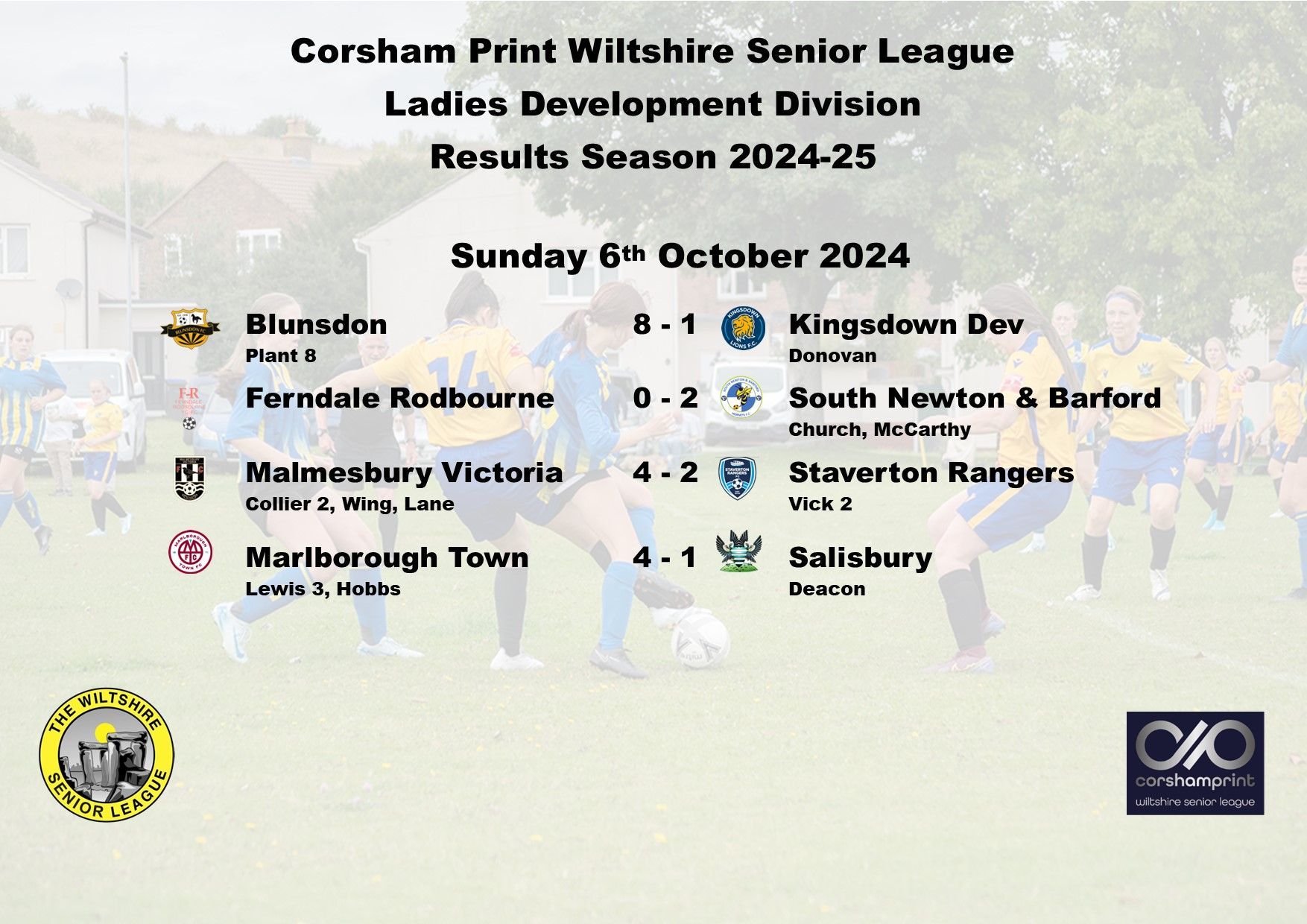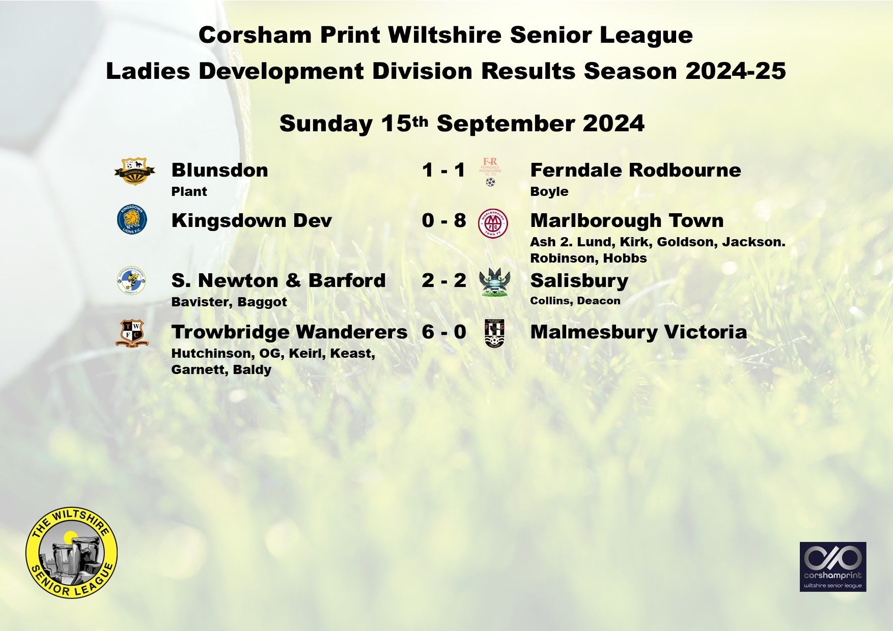 The early pace setters in the Ladies Development Division are Malmesbury Victoria who registered their second straight win with a 4-1 against Blunsdon in a game played at the Red Bull ground due to the ongoing pitch maintenance at the Flying Monk Ground. Lisa Lane scored two, making it three for her from the opening two games, with further goals from Rose Anjos and Emma Sharpe, the Blunsdon goal was scored by Lyndsey Plant.
