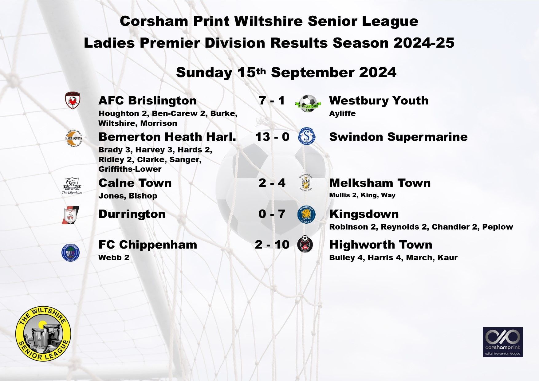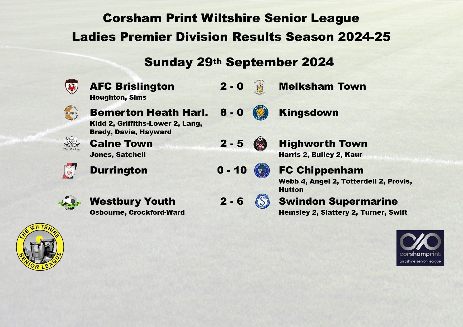 Kingsdown bounced back from their own heavy defeat at the hands of Bemerton the previous week with a hard fought 3-2 win over AFC Brislington, Shannel Baldwin, Charlotte Chandler and Hollie Lewis with the goals for Kingsdown, Charlotte Morrison and Libby Sims with the AFC Brislington goals.