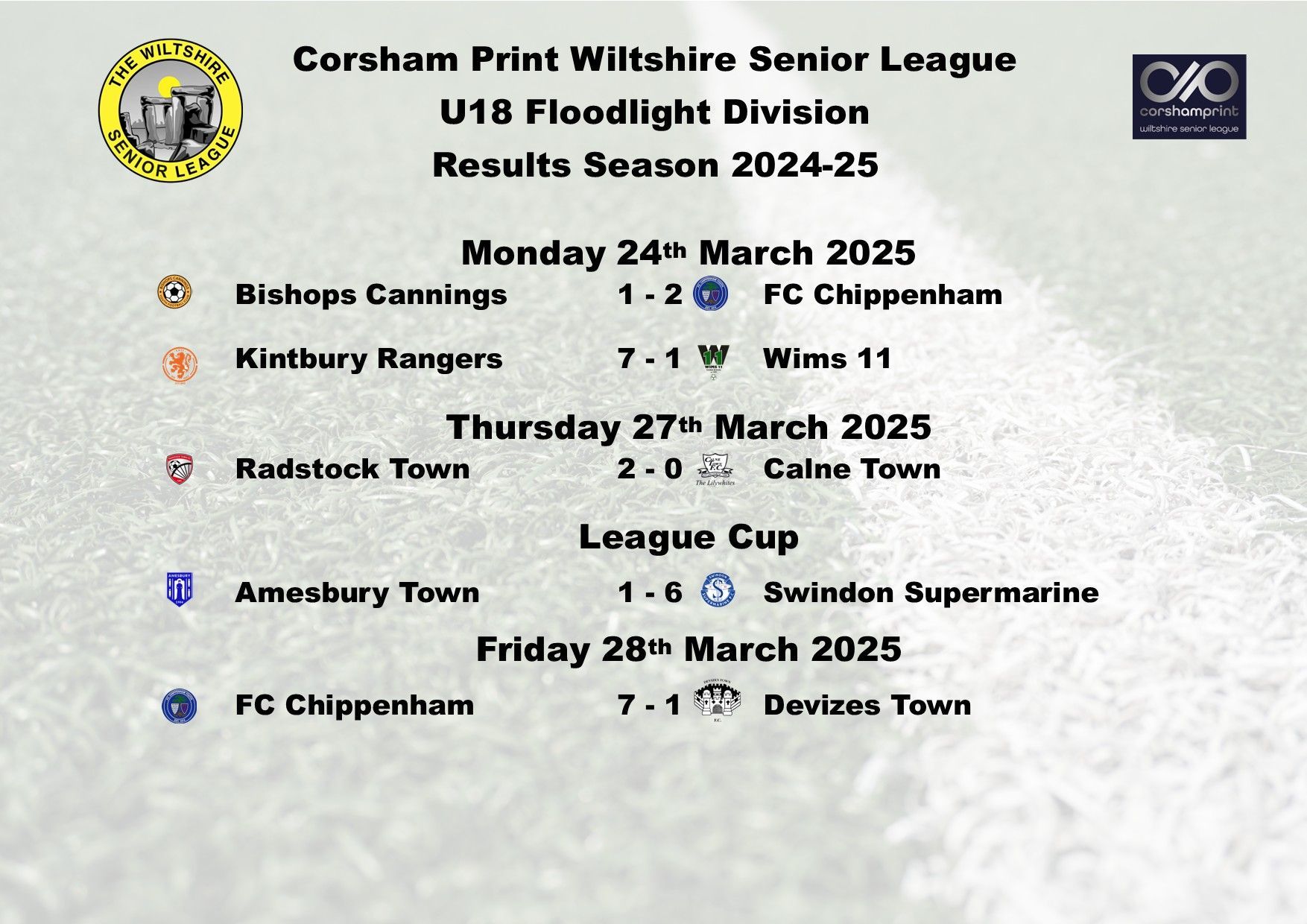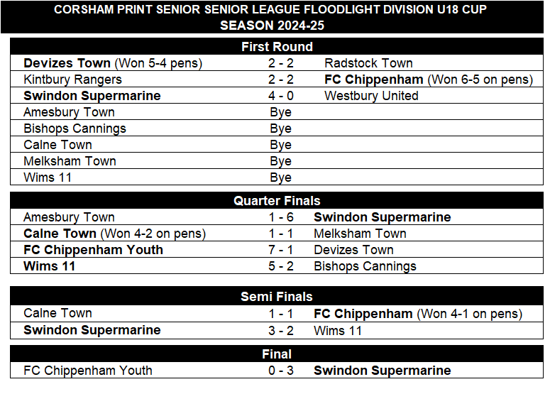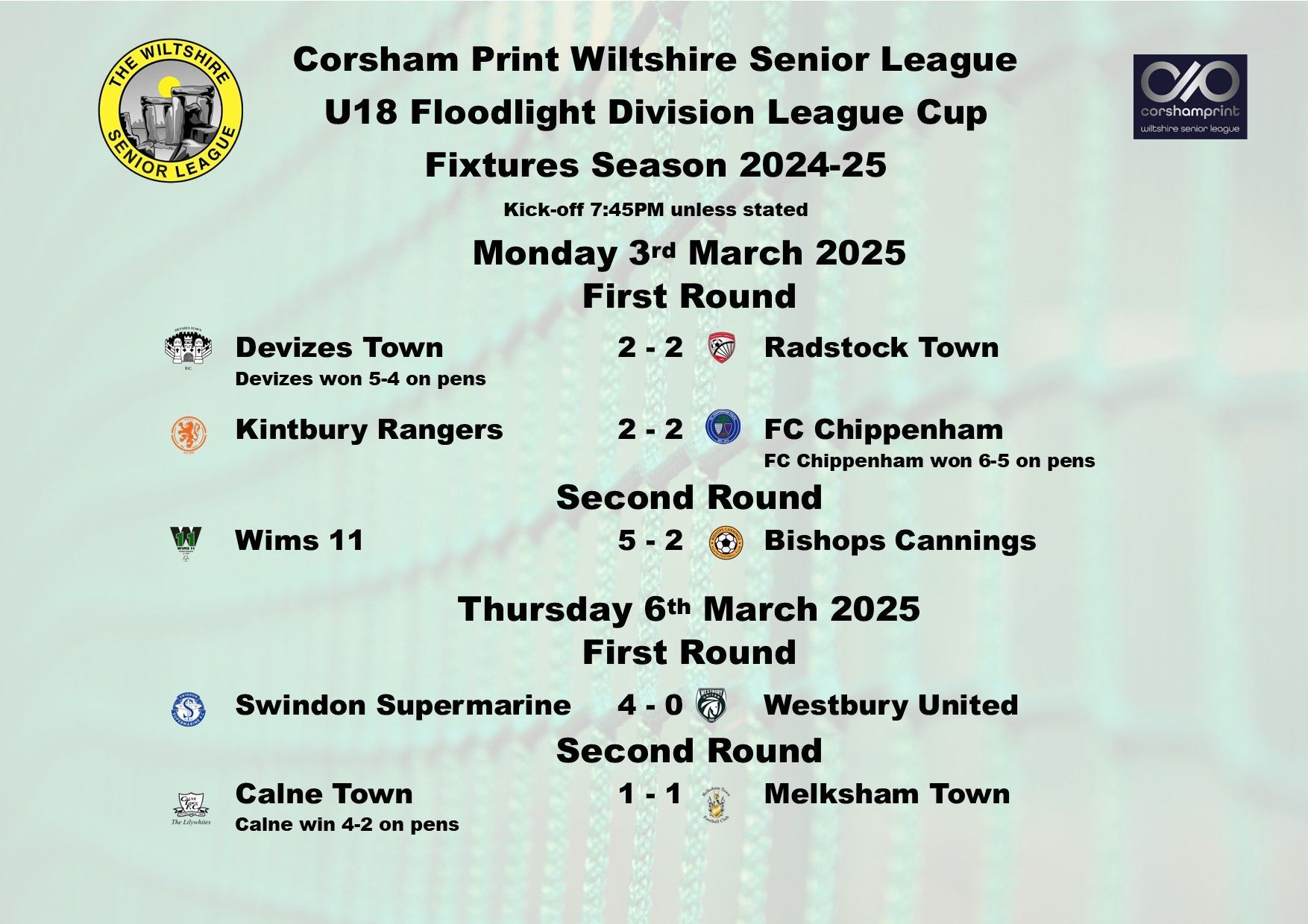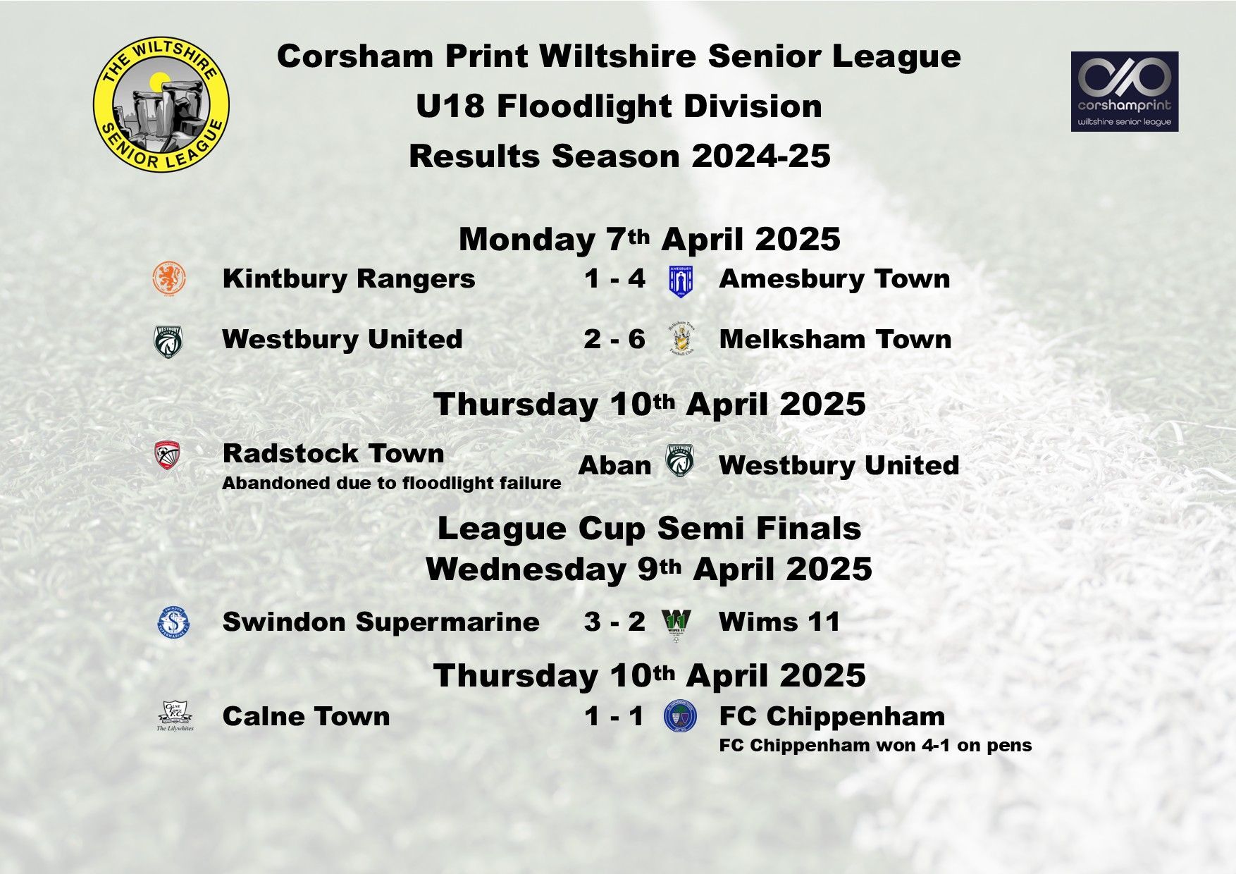 There were four games played last week in the Under 18 Floodlight Division of the Corsham Print Wiltshire Senior League, two in the League and two in the League Cup.