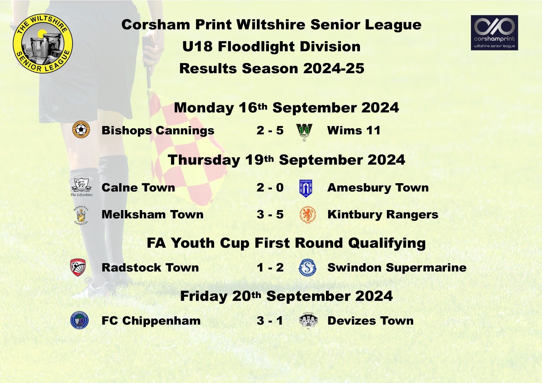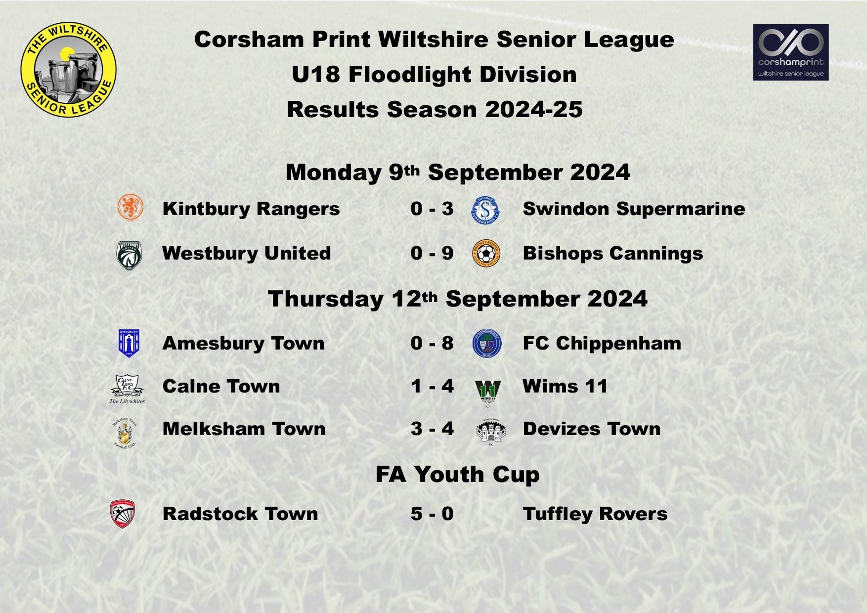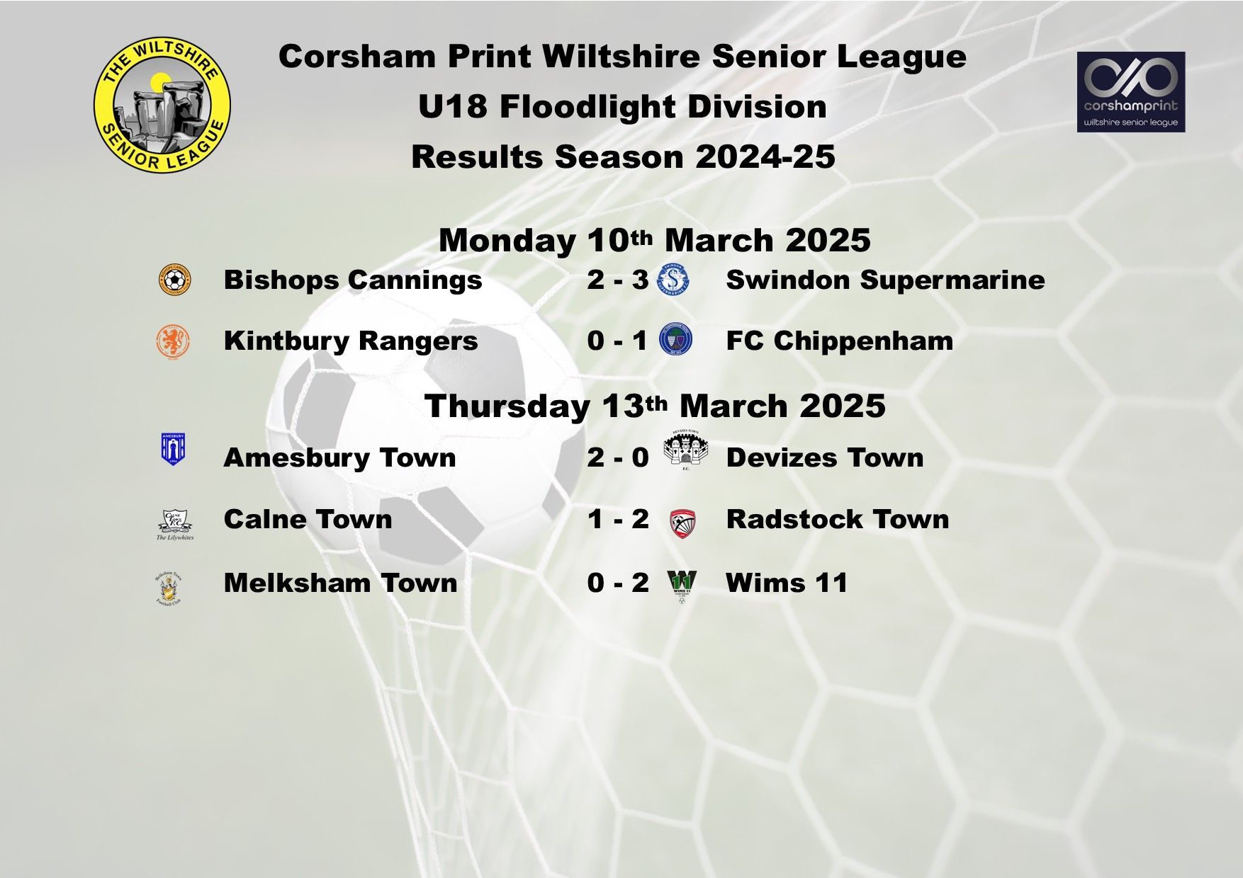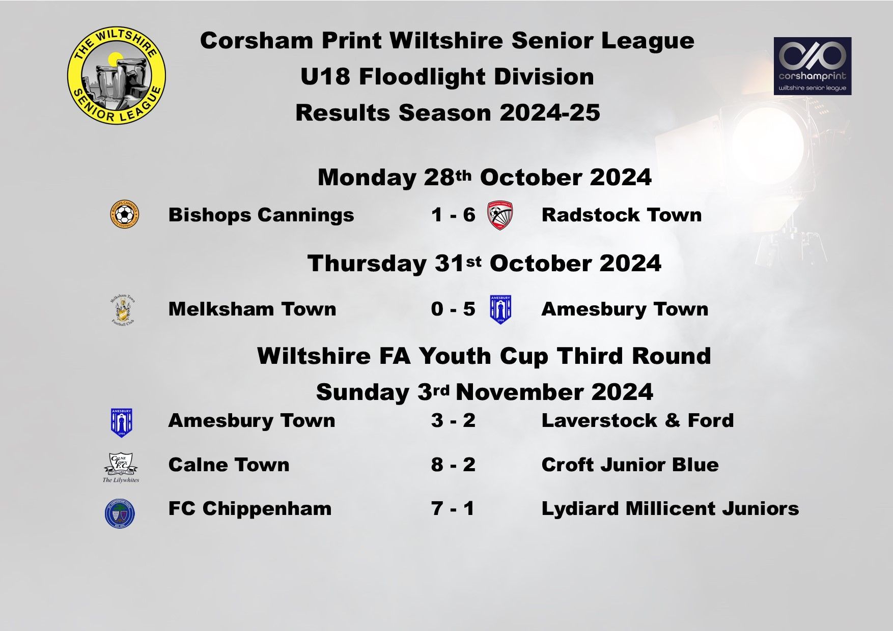 There were four games played last week in the Under 18 Floodlight Division of the Corsham Print Wiltshire Senior League, two in the League and two in the League Cup.