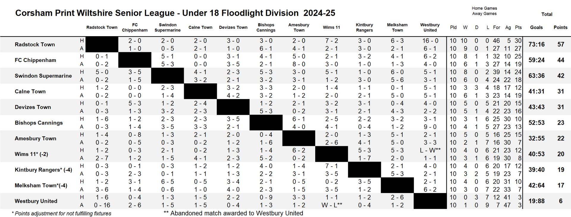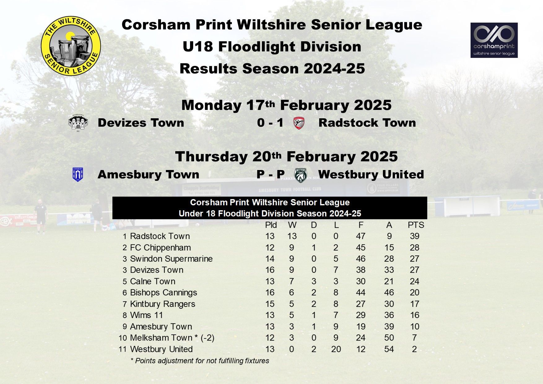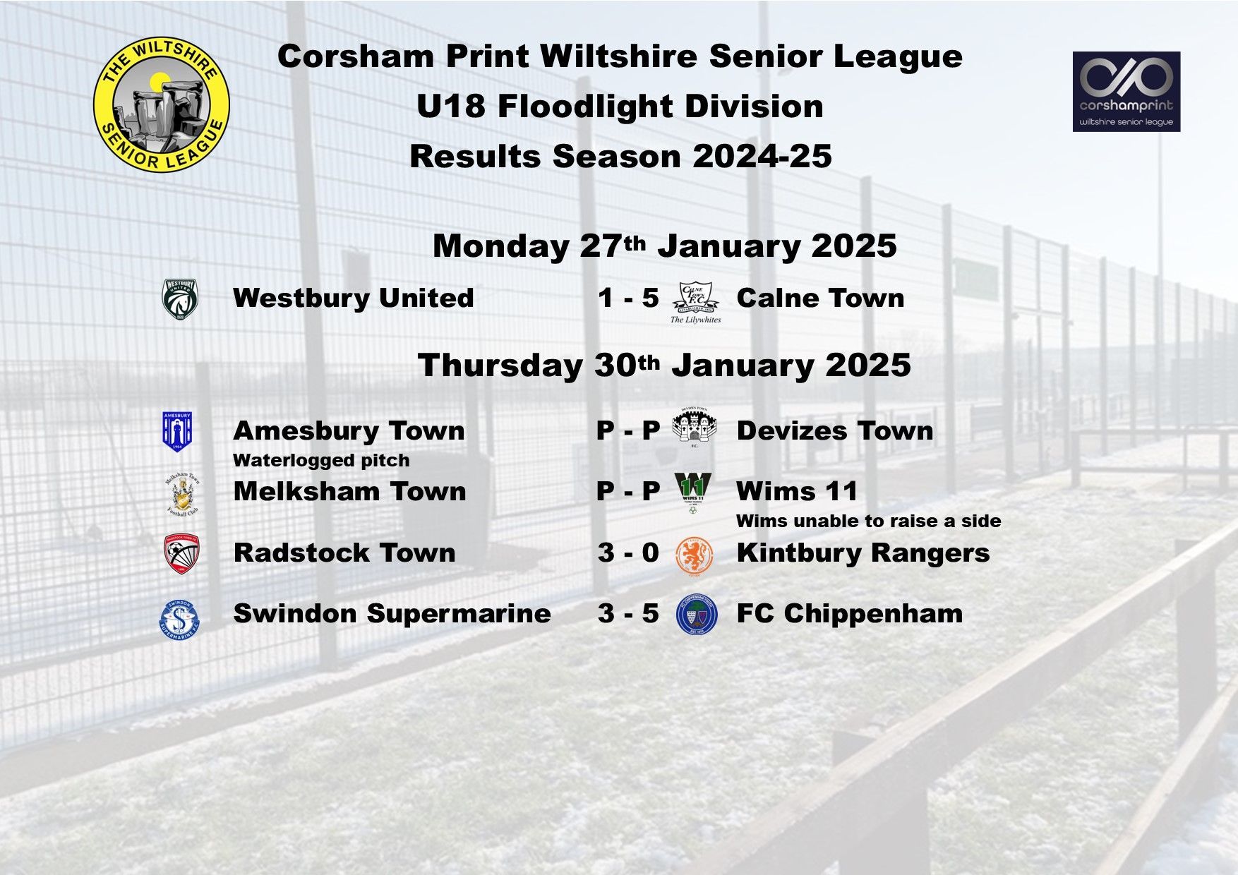 The other game on Monday night between Wims 11 and Westbury United was unfortunately abandoned by the referee due to misconduct and the League now await the disciplinary verdict from the Wiltshire FA regarding the matter before any decision can be taken regarding what happens with the game.