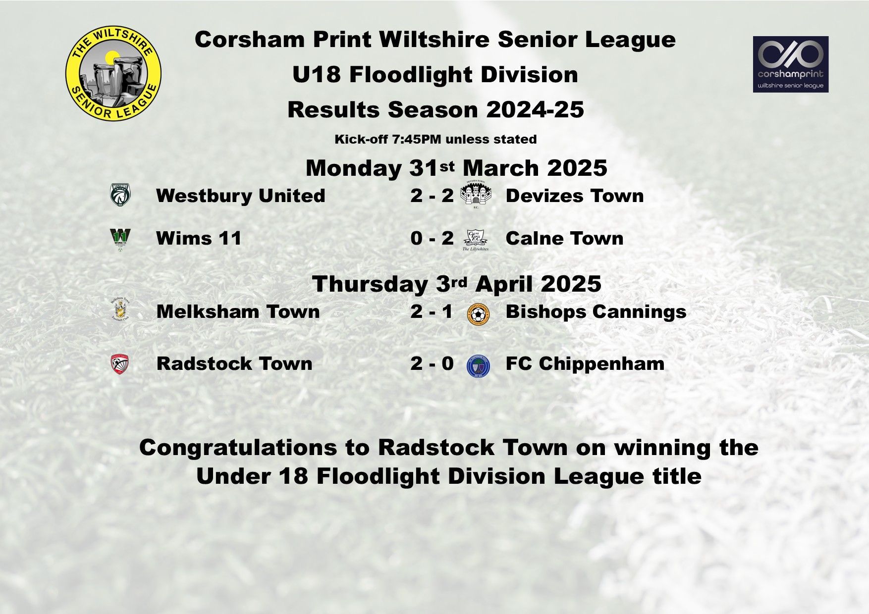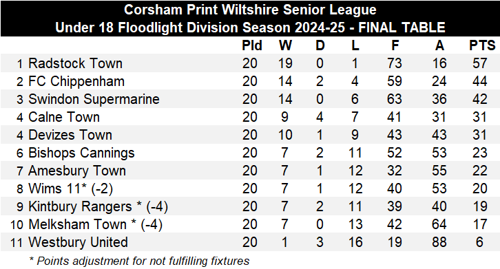 Last Thursday saw Radstock Town secure the Under 18 Floodlight Division league title with win number 17 of the season, a 2-0 victory against the side who were the only one who could have caught them, FC Chippenham. Congratulations to Radstock Town on their title success. With three games to go they will now be aiming to achieve a perfect record, matching what Melksham Town achieved in Season 2018-19 albeit it would be playing twice as many games than that earlier season. Radstock’s three final games are against Westbury United, Swindon Supermarine and Melksham Town. FC Chippenham meanwhile are likely to have the consolation of finishing as runners-up. They are currently seven points ahead of both Swindon Supermarine and Calne Town with FC Chippenham having four league games to play against Melksham Town twice, Kintbury Rangers and Calne Town.