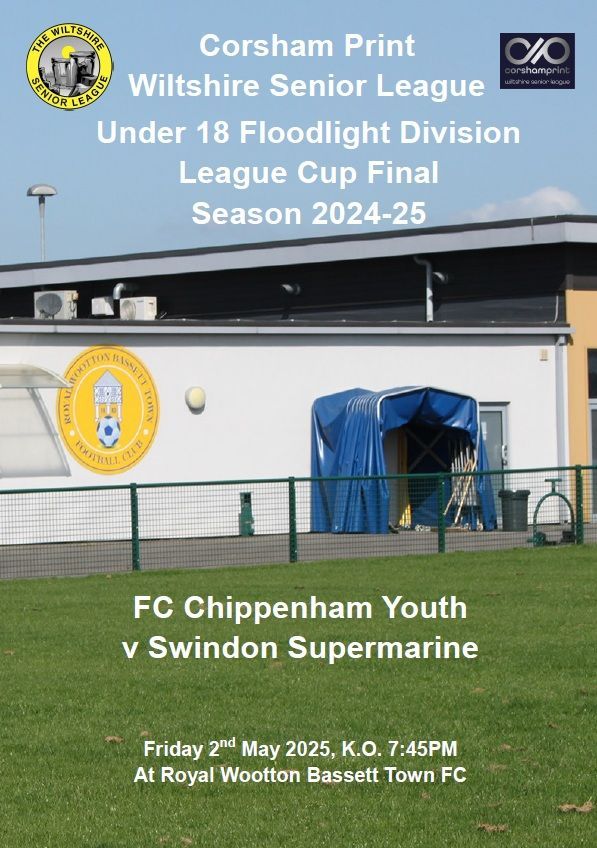 On a warm Friday evening, the game at Royal Wootton Bassett Town drew a sizeable crowd with 126 paying customers accompanied by a sizeable number of concessions, both young and old. The large crowd would witness an entertaining final that was a lot closer than the final score line would suggest. In a tight first half Swindon Supermarine had slightly the better of things. They went close to opening the scoring on 13 minutes with an effort that came back off the FC Chippenham crossbar but the game would remain without a goal until five minutes before the break. It was to be Swindon Supermarine who finally got themselves in front, a dangerous ball into the box seeing the Supermarine striker nip in before the FC Chippenham keeper could reach the ball to give his side the lead at the break with all still to play for in the second half.