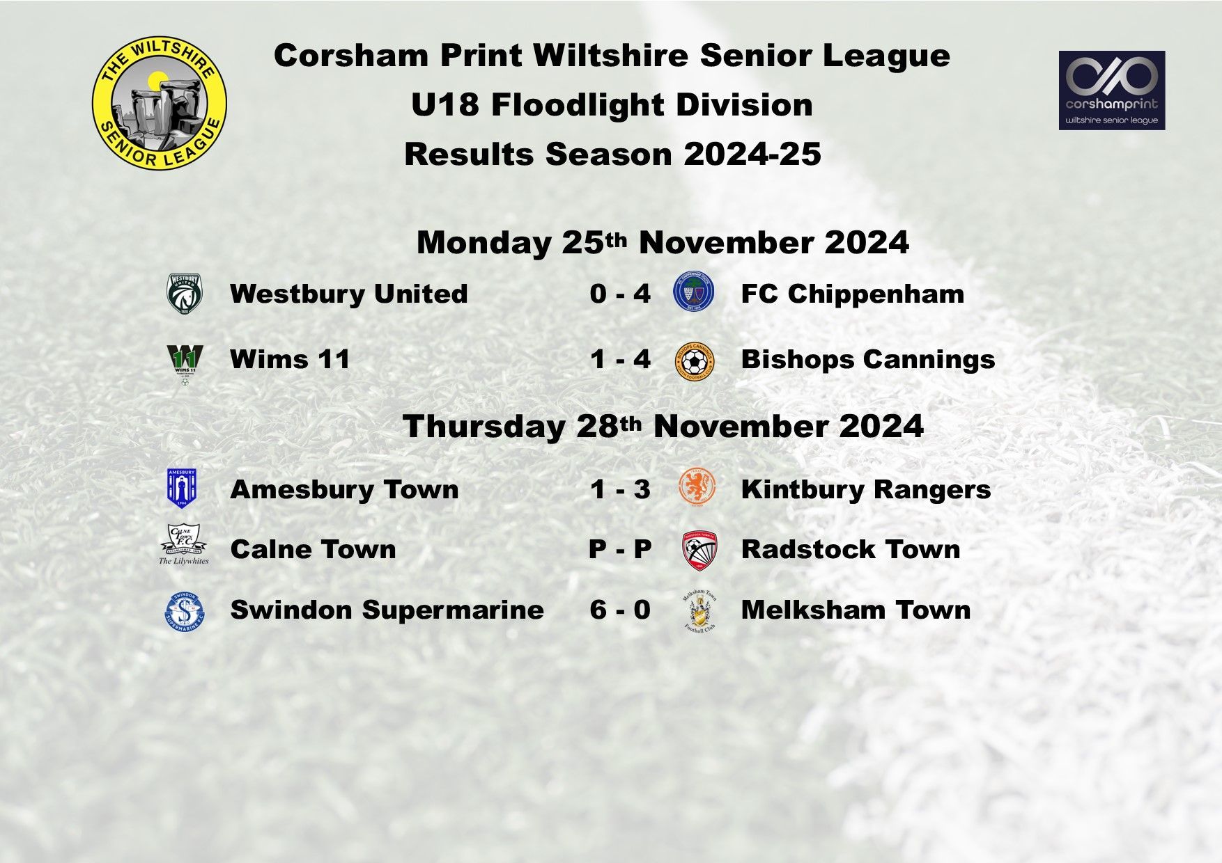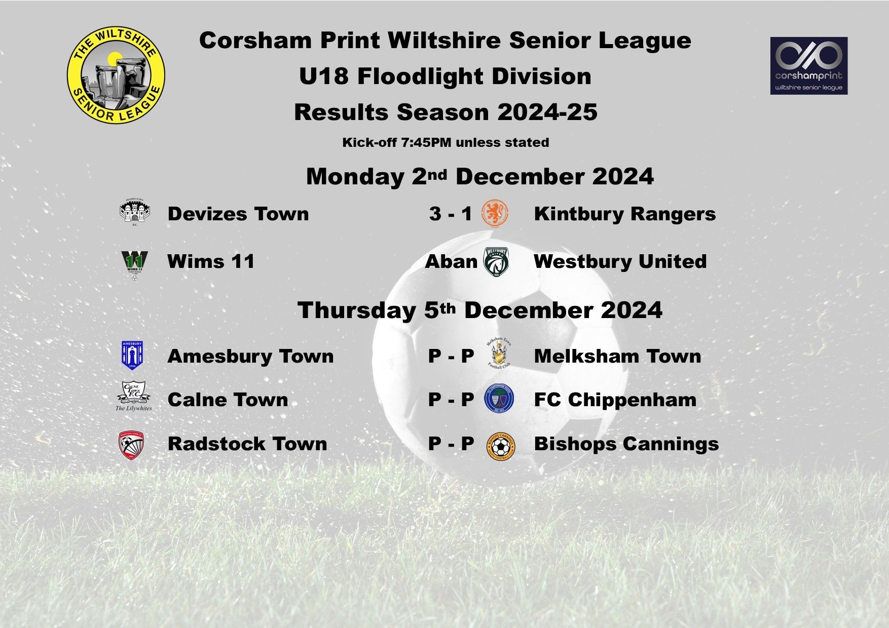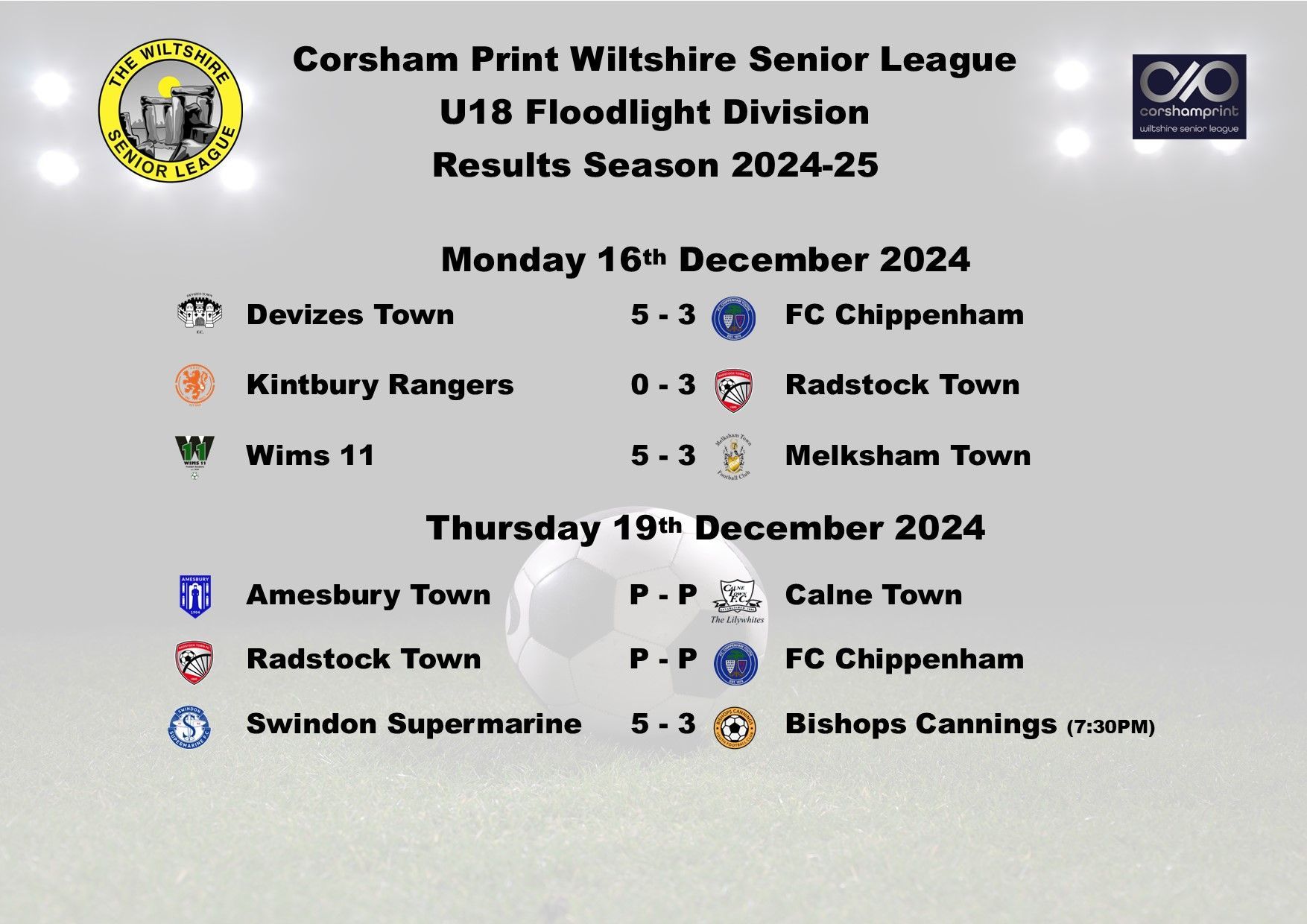 Due to Christmas, there are no games next week, the action will recommence on Monday 6th January. Best wishes from all of the Management Committee at the Corsham Print Wiltshire Senior League to our U18 Division sides for a happy Christmas and a happy and prosperous New Year.
