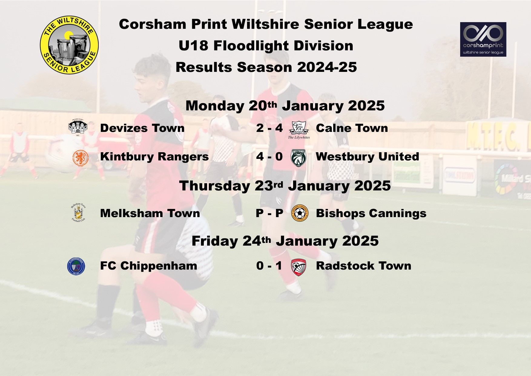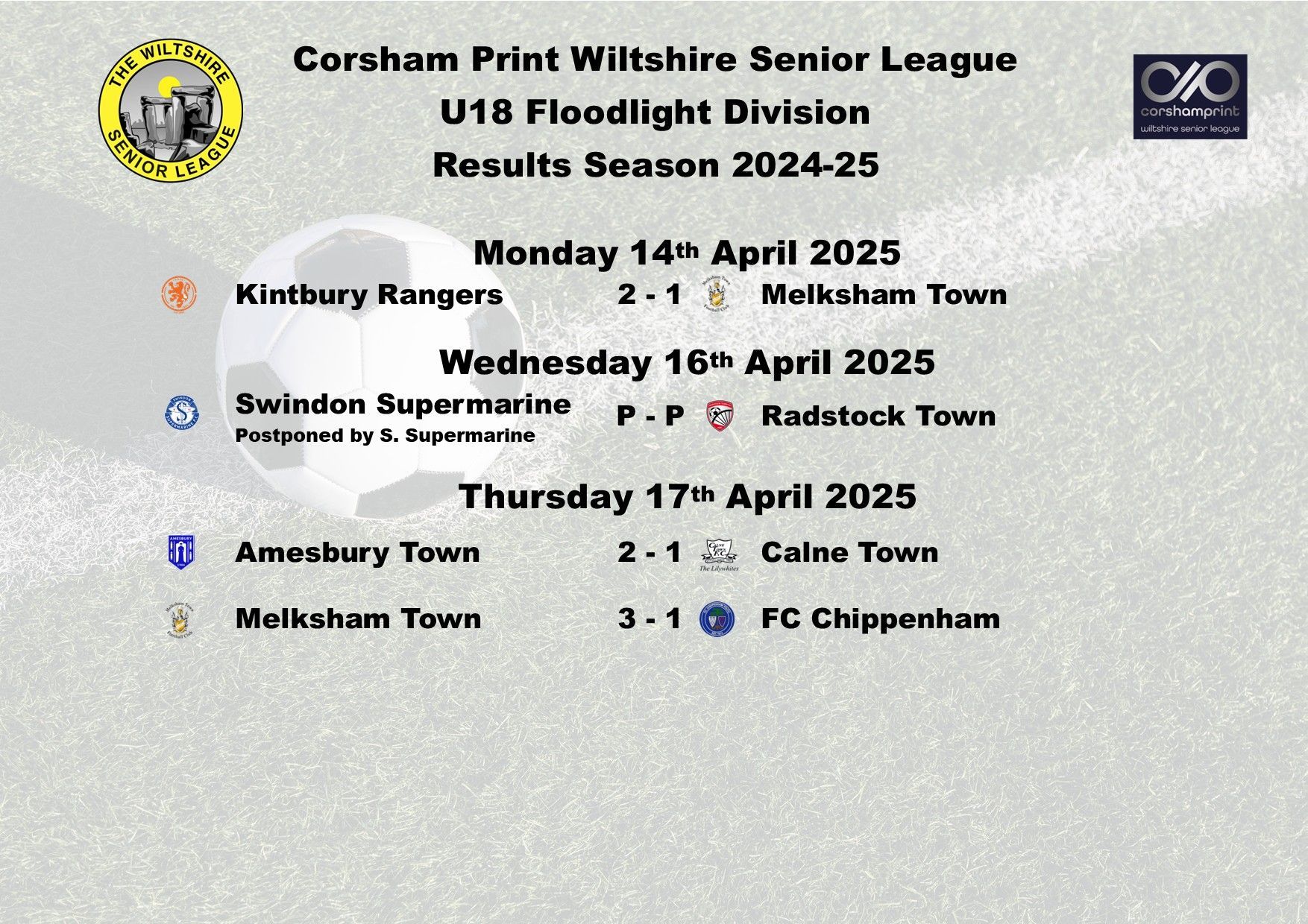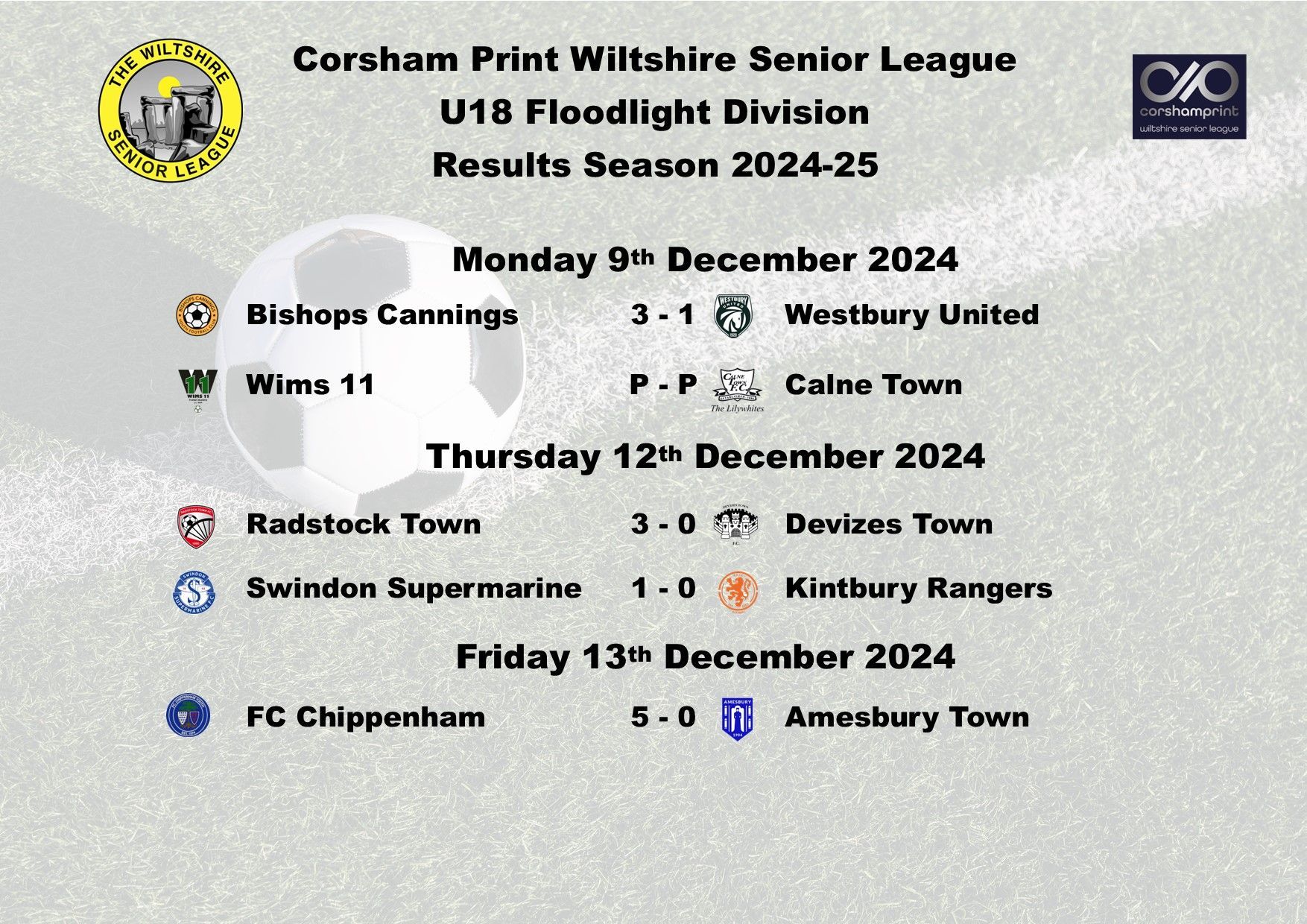 Due to Christmas, there are no games next week, the action will recommence on Monday 6th January. Best wishes from all of the Management Committee at the Corsham Print Wiltshire Senior League to our U18 Division sides for a happy Christmas and a happy and prosperous New Year.