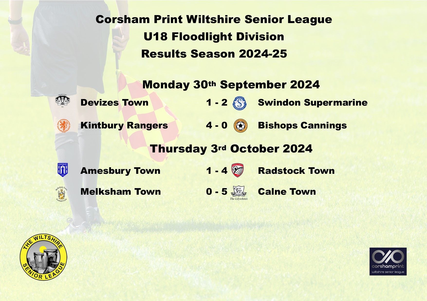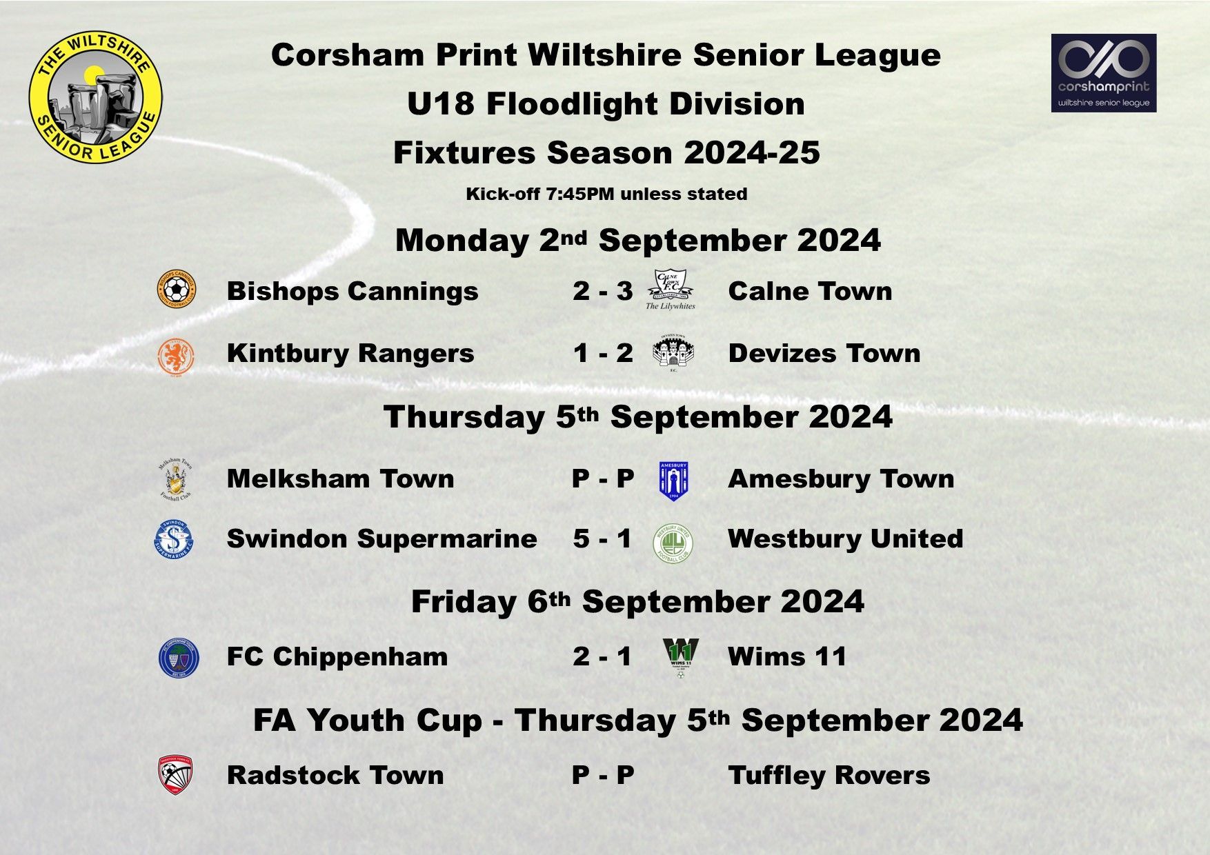 The Under 18 Division kicked-off on Monday night and it saw away wins for both Calne Town and Devizes Town, Calne winning 3-2 at Green Lane against Bishops Cannings and Devizes securing an impressive 2-1 victory at last season's champions Kintbury Rangers.