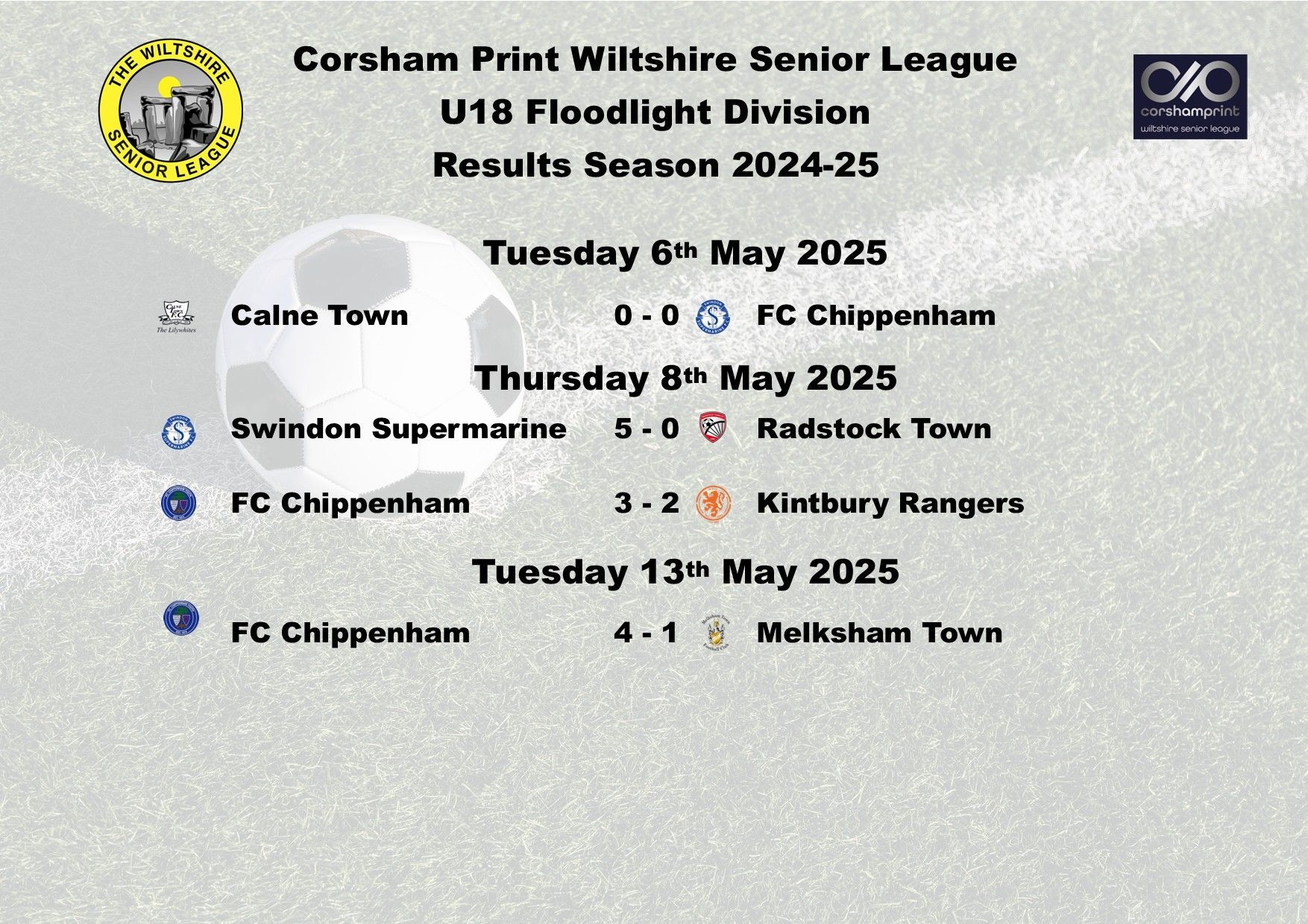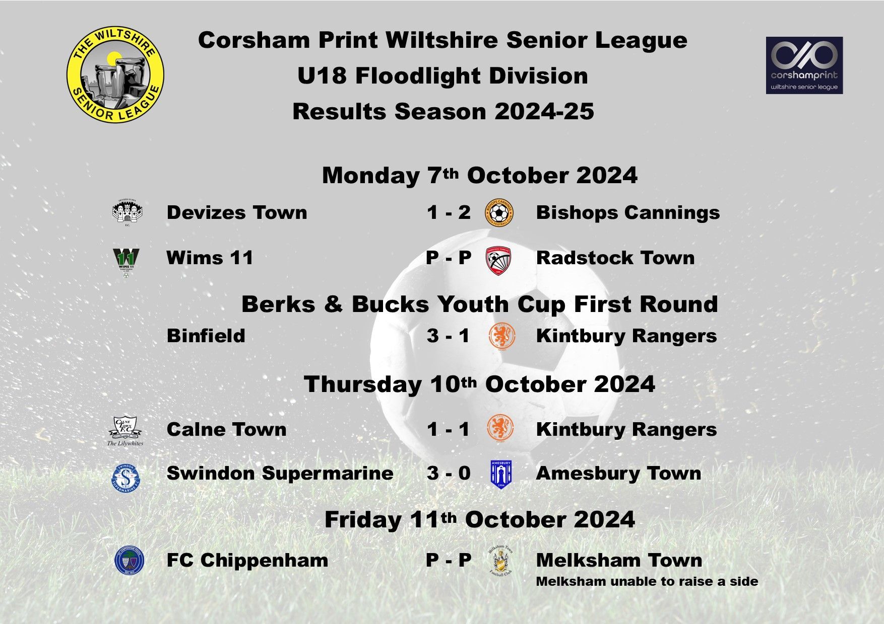 The wet weather returned to put paid to two of the scheduled games in the Under 18 Floodlight Division of the Corsham Print Wiltshire Senior League. Monday night’s scheduled encounter between Kintbury Rangers and Radstock Town and Thursday night’s game between Calne Town and FC Chippenham being the two games lost.