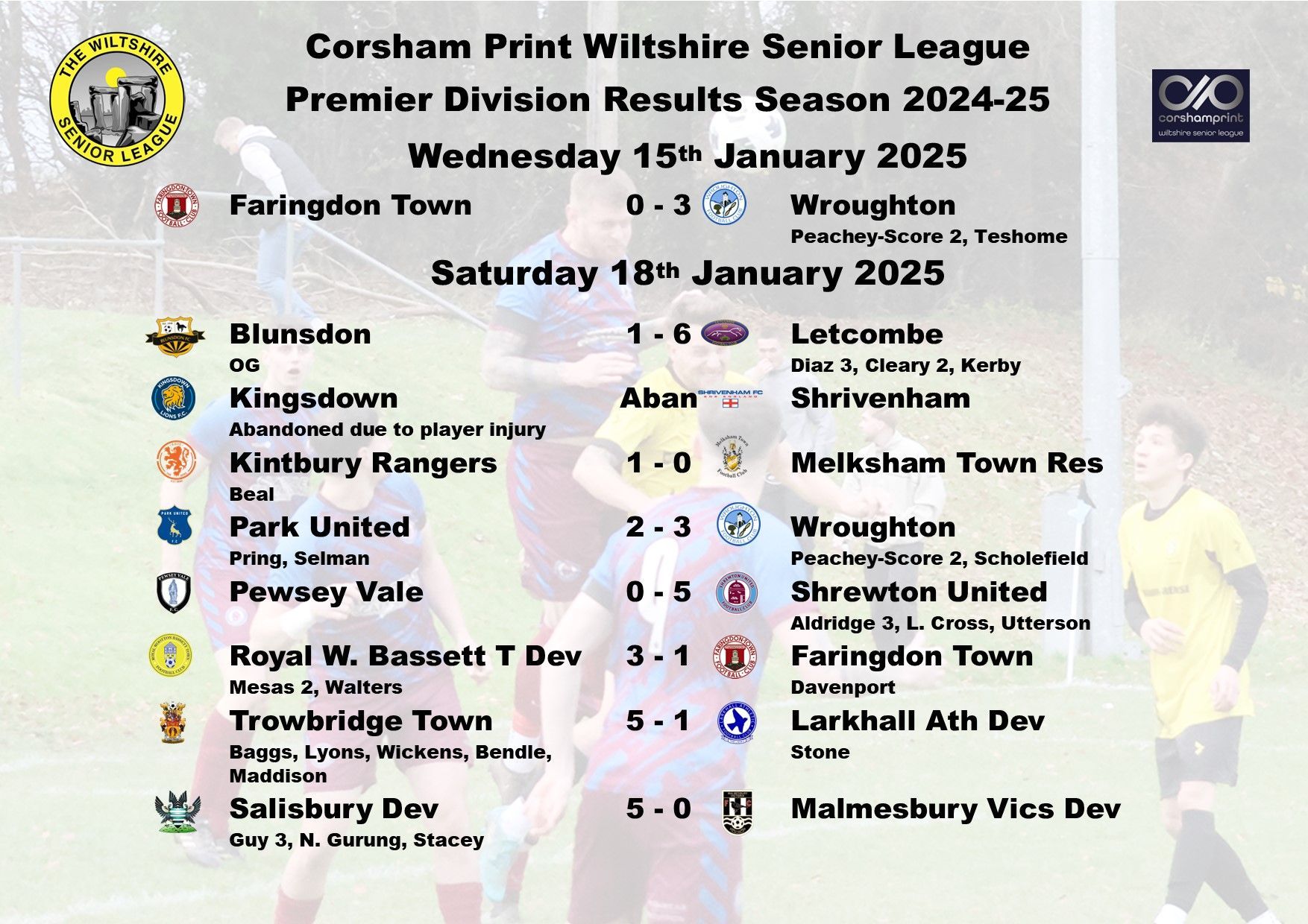 Just two points and one place separated Shrivenham and Kingsdown in the table ahead of their game at Kingsdown School, switched to the 3G due to issues with the pitch at Southbrook Rec. The game unfortunately would not go the full duration. After having given his side a 1-0 lead Shrivenham’s Alex Harrison was later seriously injured with a suspected double fracture of his leg and the game was abandoned with an ambulance called. The ambulance did not arrive for some time and the Shrivenham club put out on social media their thanks to Kingsdown manager Adrian Wilkinson and his players and referee Steve Southam for their support and empathy given to the injured player and how the situation was handled. All at the Corsham Print Wiltshire Senior League wish Alex a full and speedy recovery from this serious injury.