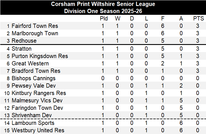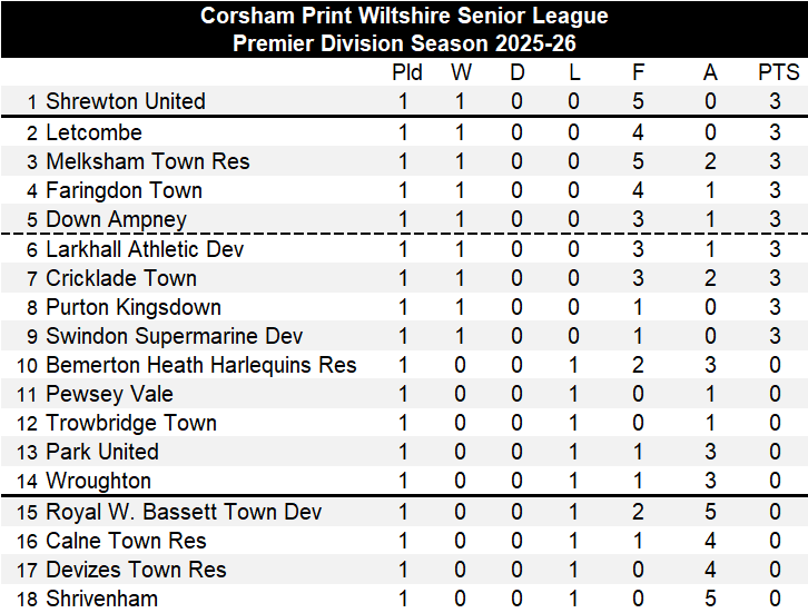 The three final midweek fixtures are on Wednesday night with Swindon Supermarine Dev and Down Ampney, who both won on Saturday, meeting at Supermarine. Melksham Town Reserves will look to record back-to-back wins to open the season when they entertain Devizes Town Reserves, whilst Park United play their first game at their new home at Corsham Town when Trowbridge Town are the visitors, with both teams looking to get their first points of the season.