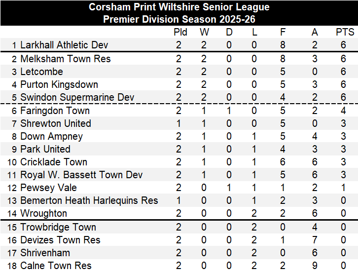The early leaders are Larkhall Athletic Development who followed up their 3-1 win over Wroughton on Saturday with an impressive 5-1 away win over Calne Town Reserves. On target for Larkhall were James Okell with two, Ben Wickens, Angus Williamson and James Horrocks with his second of the season, former Pewsey Vale Development player-manager Kierron Kiff with the Calne Town Reserves goal.