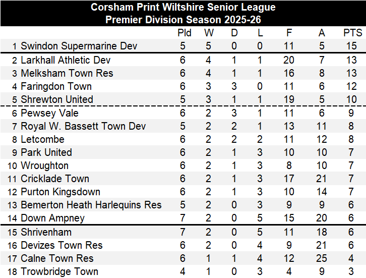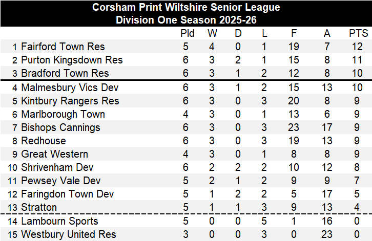 Fairford were not the biggest winners of the day in the division though as Kintbury Rangers Reserves put eight goals past Westbury United Reserves without reply. Charlie Allsop scored four of the Kintbury goals to take his total for the season onto seven, with the other goals coming through Daniel Wyles, Paul Hirst, Aiden Maycock and Ryan Hutchings. A tough start for Westbury who have now lost all three of the games they have played so far but hopefully their issues with raising a side at the start of the season are now behind them. The win for Kintbury saw them move up to fifth place in the table.