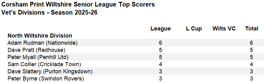 There were four games played in the Mid Wiltshire Veterans’ Division with both Devizes Town and Durrington maintaining their lead at the top of the table with victories. Durrington won 1-0 away at Calne Town whilst Devizes Town were comfortable 5-0 winners against Barford Hornets thanks to a hat-trick from Chris Allen and further goals from Daniel Sloan and Jonathan Scott to maintain their 100% winning start to the season. With four sides engaged in County Cup games next week Devizes will meet Barford Hornets again in the return league fixture next Friday.