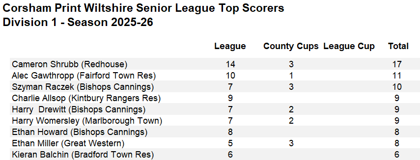 In the Gloucestershire Senior Amateur County Cup, Division One leaders Fairford Town Reserves progressed to the Second Round with a 1-0 win at Barnwood Utd, leading scorer Alec Gawthropp with his eleventh goal of the season enabling his side to make it through to the next round. With withdrawals from the competition Fairford Town Reserves have been given a bye in the Second Round meaning their scheduled league game against Pewsey Vale Development on 18th October is not impacted.