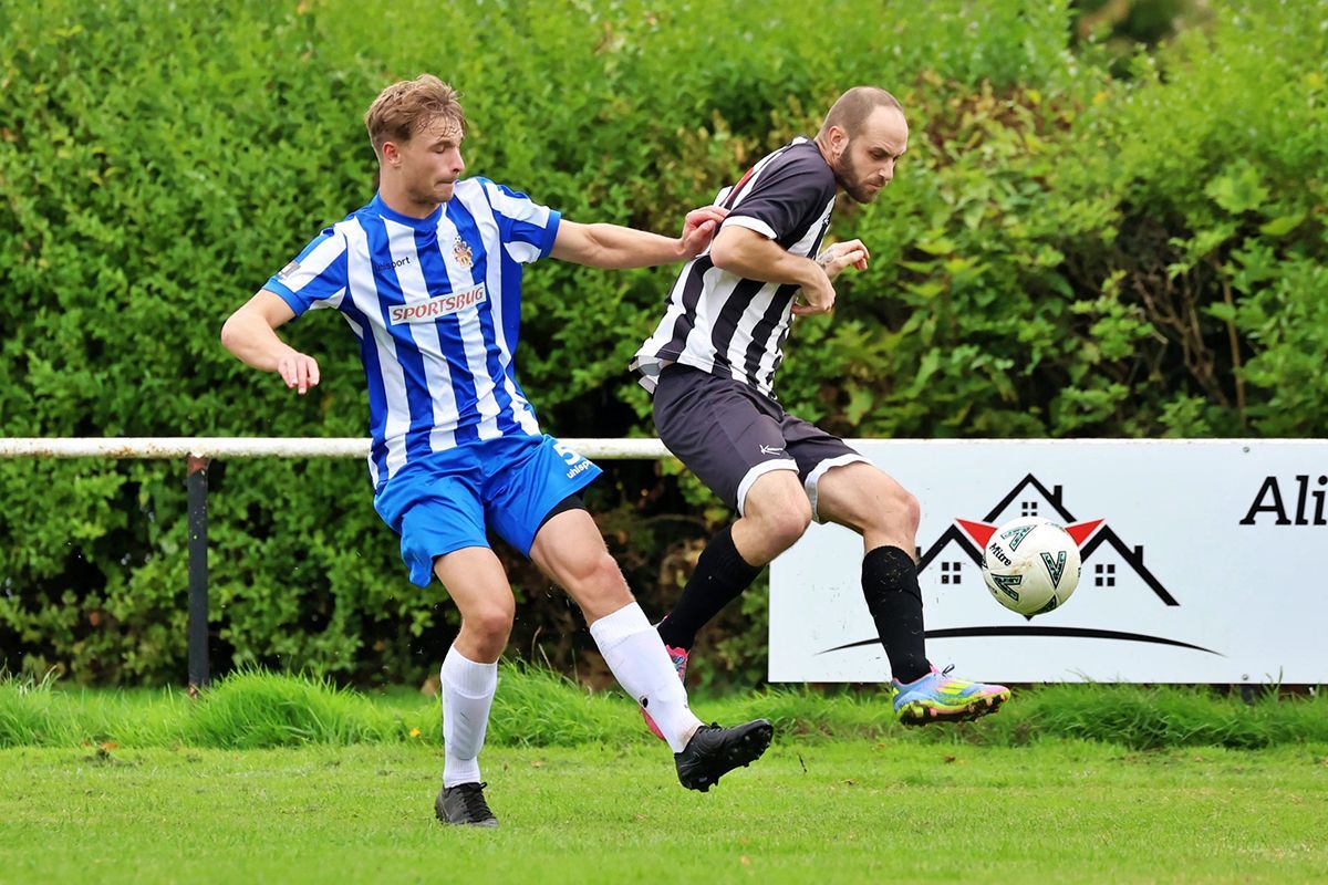 Pewsey's Ryan Banks shields the ball from Trowbridge captain Owen Pearce (picture courtesy of Martin Pearce)