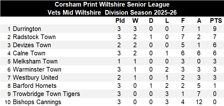 There was also a full schedule of games played in the Mid Wiltshire Veterans’ Division this week, the first time this has happened this season. Reigning champions Melksham Town got their season off to a winning start at MOD Lyneham on Monday night, Gary Higdon scoring a hat-trick in a 3-0 win over Calne Town.