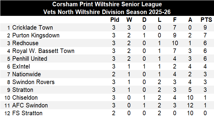 The top match in the North Wiltshire Veterans’ Division of the Corsham Print Wiltshire Senior League this week was the meeting of last season’s champions Cricklade Town and the team who had finished in third place, Redhouse on Wednesday night at Cirencester Town. Last season Cricklade had done the double over Redhouse but both teams went into their game on Wednesday night on the back of two straight wins with neither side having conceded a goal in their opening two fixtures. A close contest was anticipated, and it proved to be just that as a solitary second half goal from Dean Wilson was all that separated the two sides on the night. The win for Cricklade sees them sit top of the table two points clear of second place Purton Kingsdown after three games.