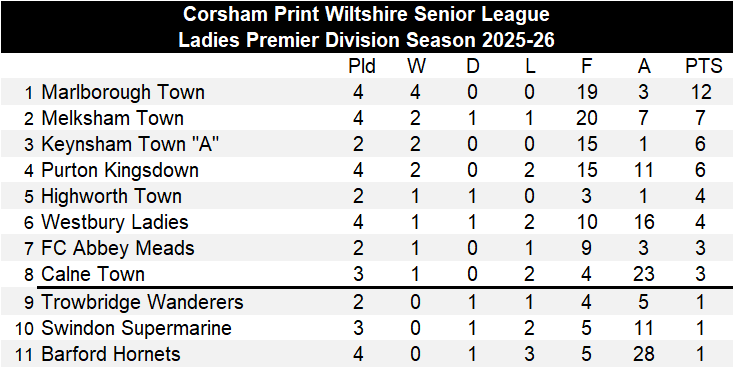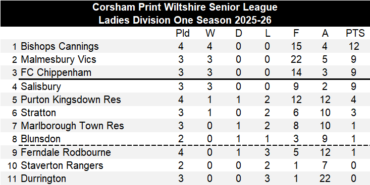 Three other teams also maintained their 100% winning start to the season but all three have played one game less than the leaders. Malmesbury Vics picked up their third win of the season away at Ferndale Rodbourne, a hat-trick from Rhianon Stidever and one from Emma Sharpe securing a 4-1 win, Shannon Fenton with a second half goal for Ferndale Rodbourne. Malmesbury sit second in the table ahead on goal difference from FC Chippenham and Salisbury.