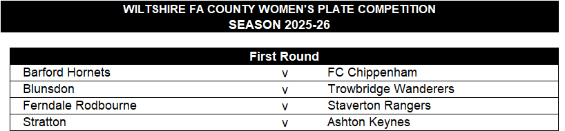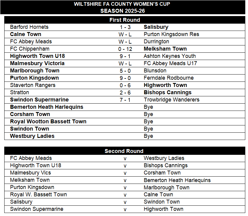 The Wiltshire FA have made the draw for the Second Round of the Women's County Cup and also the Plate competition for teams who played and lost in the First Round of the County Cup. In the main County Cup Salisbury have been given the toughest tie of the round with the Division One side being set to host cup holders Swindon Town, who are also the highest placed side in the competition. Melksham Town, Calne Town and Division One side Malmesbury Vics have all also been given tough games against Tier 6 sides from the South West Regional Women's League Division One North, Melksham are home to last seasons Wiltshire Senior League champions Bemerton Heath Harlequins, Calne Town are away to Royal Wootton Bassett Town whilst Malmesbury are set to host Corsham Town.