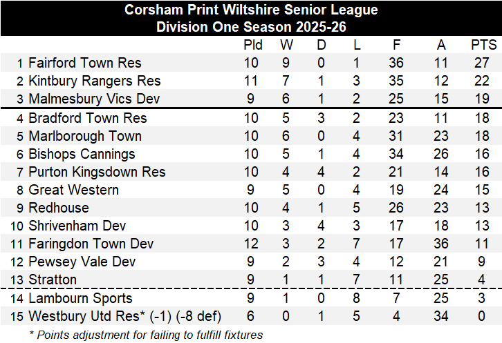 With eight sides from Division One of the Corsham Print Wiltshire Senior League involved in the Wiltshire FA County Junior Cup there were just two league games this weekend in Division One. Second placed Kintbury Rangers Reserves closed the gap to league leaders Fairford Town Reserves to five points with a 3-1 away win at Faringdon Town Development. First half goals from Paul Hirst and Luca Hill saw Kintbury lead 2-0 at the break and a third after the restart from Demiji Adebayo with just one in reply from Faringdon saw Kintbury secure their seventh win of the season. They have played one more game than Fairford Town Reserves, but the teams have yet to play each other with the first fixture between the sides set to take place later this month.