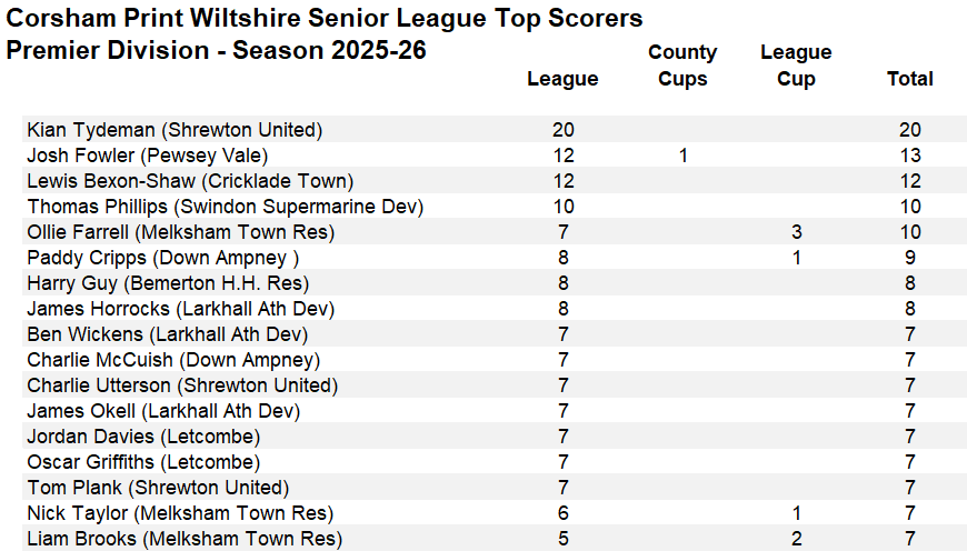 There was just one league game played in midweek in the Premier Division of the Corsham Print Wiltshire Senior League, and it saw Shrewton United close the gap to the top two sides with a 3-2 win away at Devizes Town Reserves. Shrewton actually led 3-0 at one stage thanks to two more goals from Kian Tydeman, that saw him take his tally for the season to 20, and one from Sanjay Samuda. However, two late goals for Devizes from Kieran Gleed made the final score a lot closer but Shrewton got over the line to secure three more vital points to move to within three points of the leaders with a game in hand.