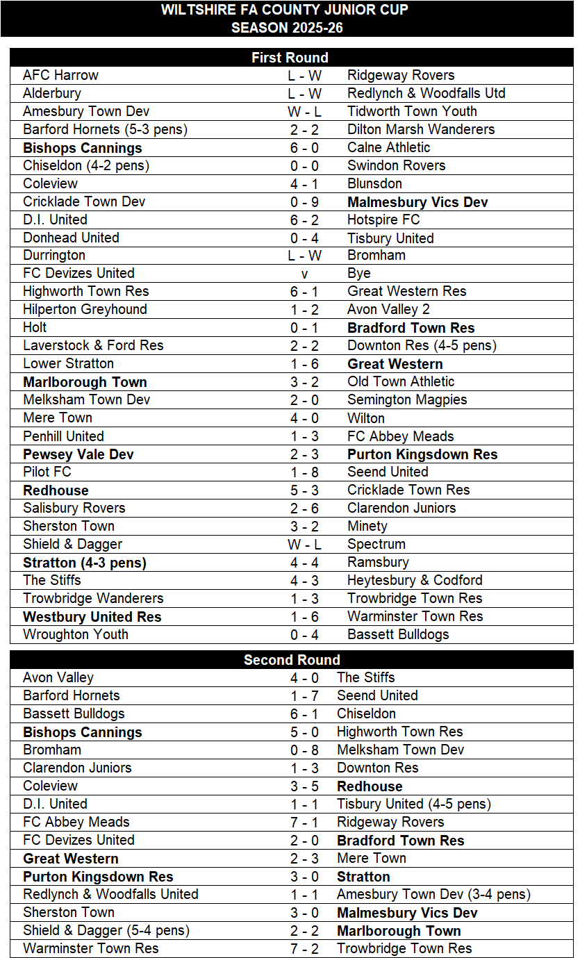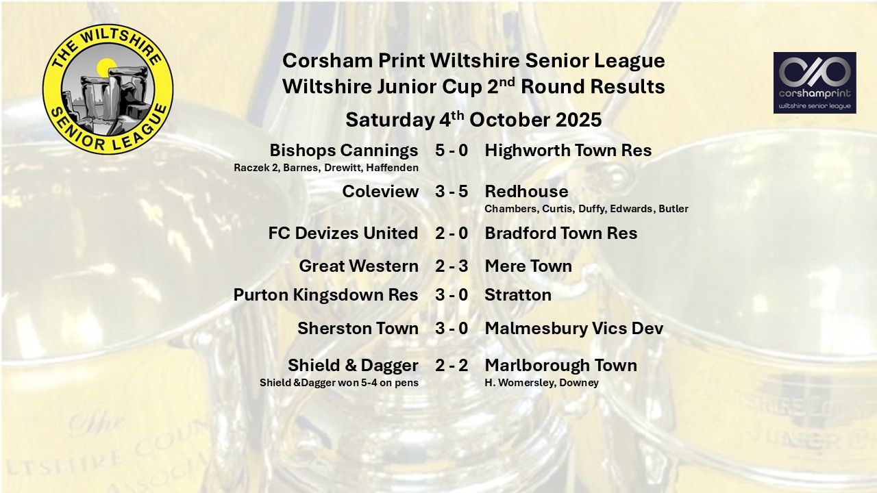 In the Second Round of the Wiltshire Junior Cup just three of the seven ties played involving sides from the Corsham Print Wiltshire Senior League saw victories for teams from the league on what proved to be a disappointing afternoon. However, both Bishops Cannings and Redhouse had a comfortable passage through to the Third Round of the competition. At Green Lane, Bishops Cannings were home to Highworth Town Reserves from the Uhlsport Hellenic League Alliance West Division in what on paper looked to be a tough tie. First half goals from Szymon Raczek and Oliver Barnes saw Bishops Cannings lead 2-0 at the break and they made sure of progress to the next round with three further goals in the second half. Raczek got his second of the game whilst a quickfire fourth and fifth for Bishops Cannings from Harry Drewitt and Ben Haffenden in the final quarter of an hour of the game made sure there was no way back for Highworth.