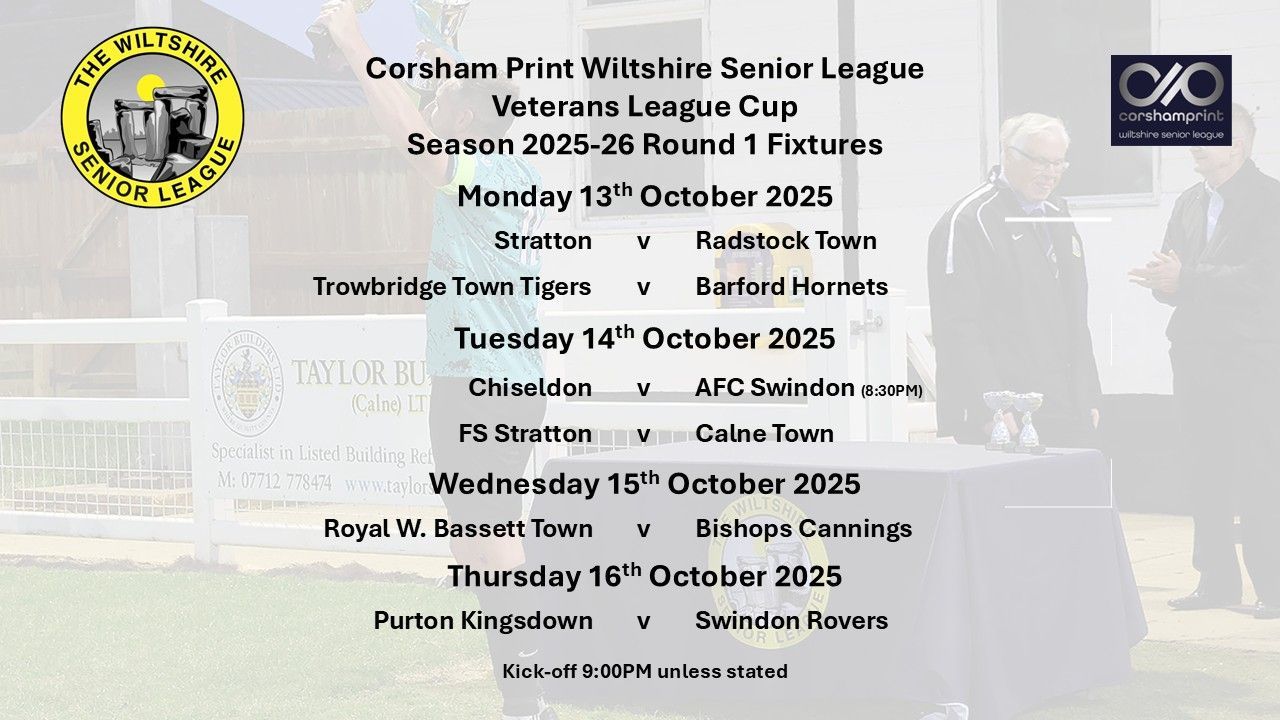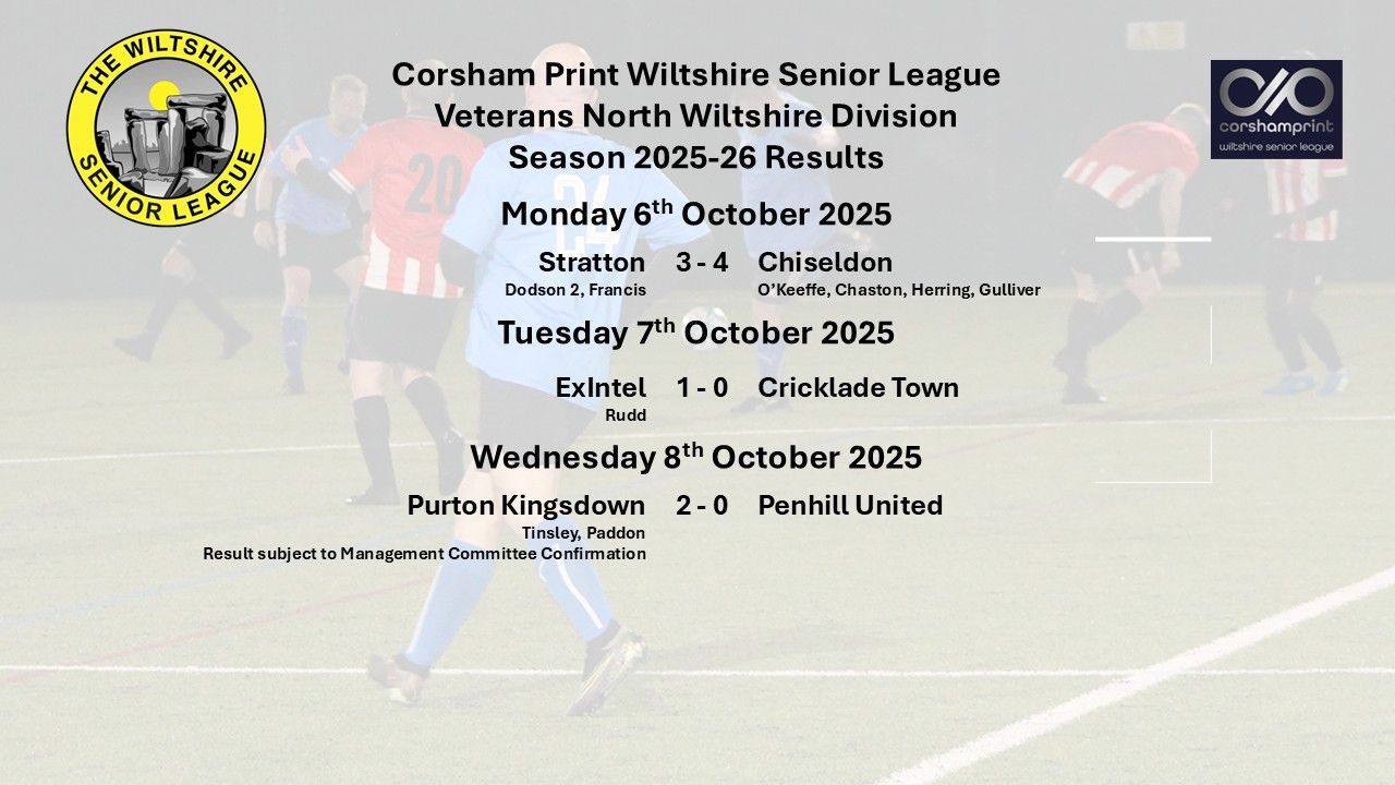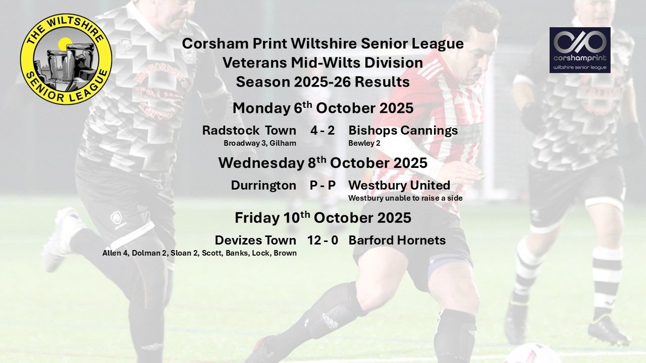 There were four games played in the Mid Wiltshire Veterans’ Division with both Devizes Town and Durrington maintaining their lead at the top of the table with victories. Durrington won 1-0 away at Calne Town whilst Devizes Town were comfortable 5-0 winners against Barford Hornets thanks to a hat-trick from Chris Allen and further goals from Daniel Sloan and Jonathan Scott to maintain their 100% winning start to the season. With four sides engaged in County Cup games next week Devizes will meet Barford Hornets again in the return league fixture next Friday.