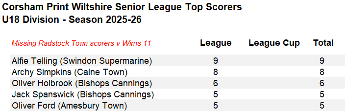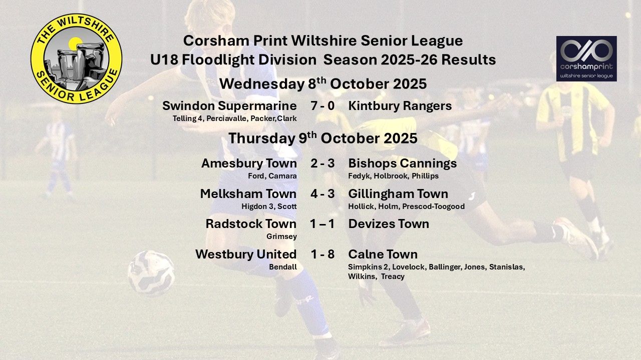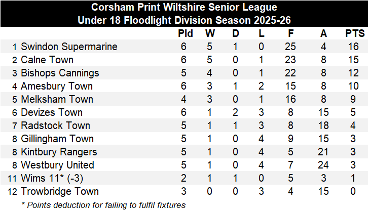 Both the top two sides in the Under 18 Floodlight Division had big wins in the latest round of fixtures. After losing their opening game Calne Town have now won five league games in a row and won six games in a row in all competitions. On Thursday night they recorded their biggest win of the season so far, beating Westbury United 8-1 on their own ground. There were two more goals for Archy Simpkins in the big win with the other goals being shared around with Finley Lovelock, Euan Ballinger, Owen Jones, Dominick Stanislas, Freddie Treacy and Ben Wilkins all scoring one apiece, William Bendall with the consolation goal for Westbury.