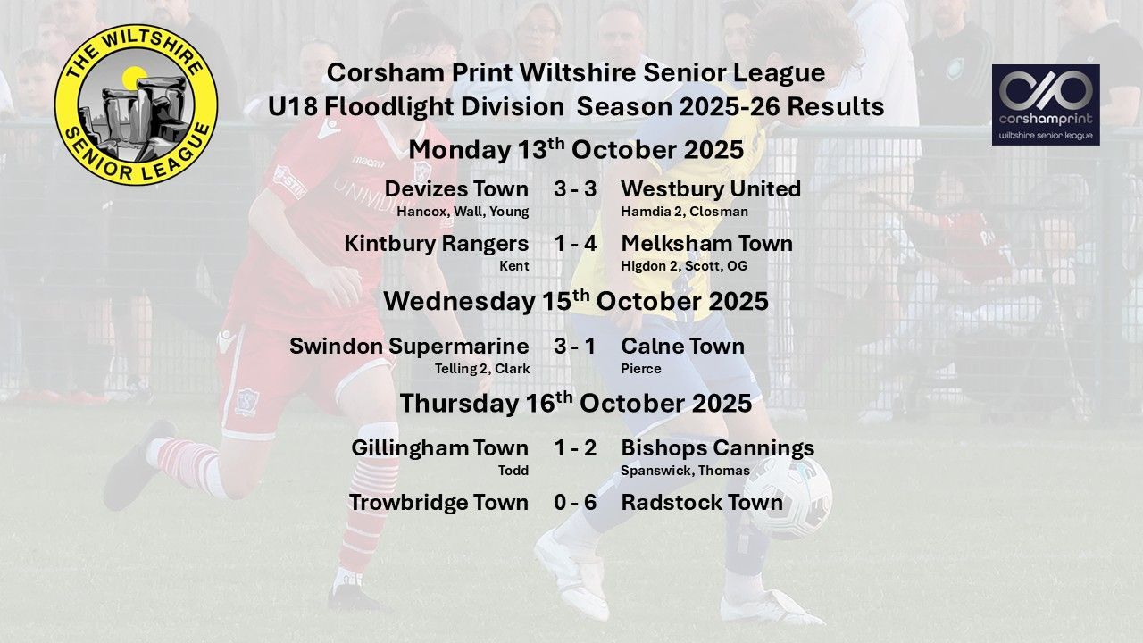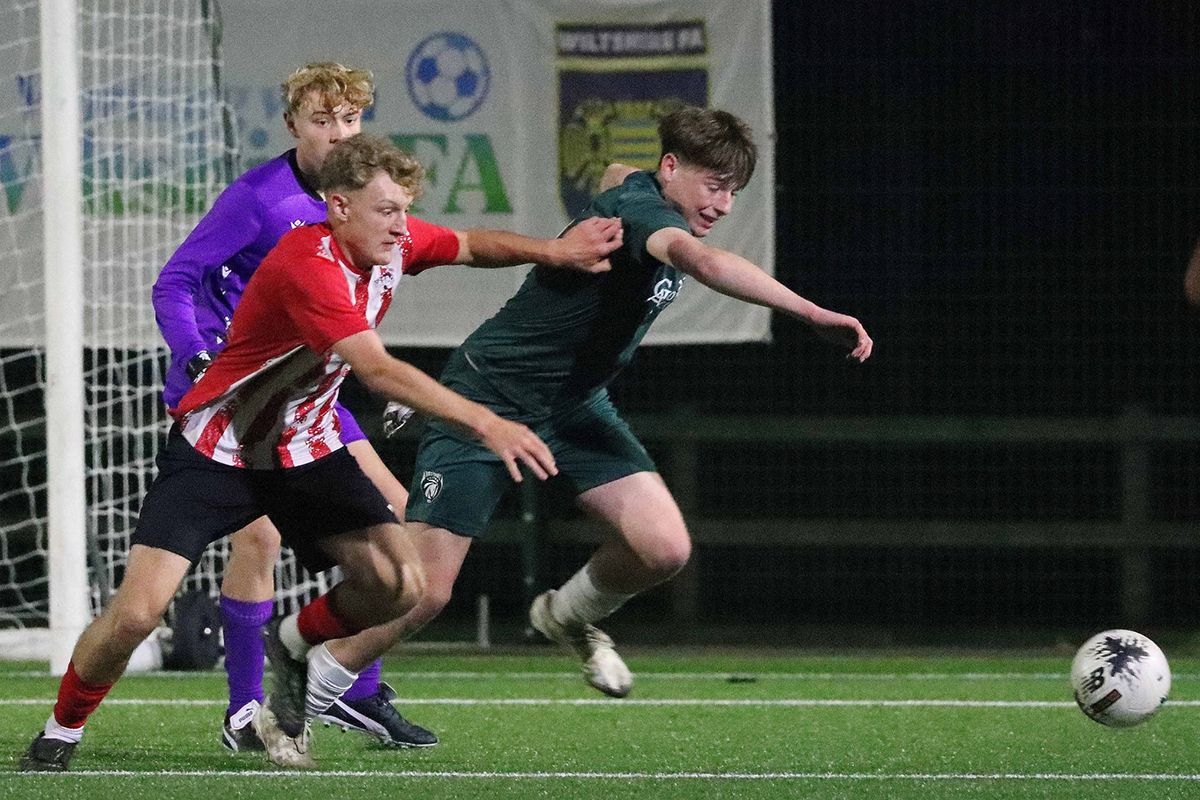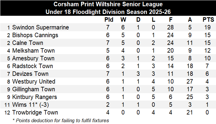 The top game in the U18 Floodlight Division of the Corsham Print Wiltshire Senior League last week was the meeting on Thursday night between the top two at the start of the week, Swindon Supermarine and Calne Town. Supermarine went into the game unbeaten in their opening six league fixtures, whilst Calne Town had lost their opening game of the season but then proceeded to win their next five to sit just one point behind the leaders ahead of the meeting of the two sides. It was to prove to be Swindon Supermarine’s night as two goals from Alfie Telling and one from Liam Clark saw them secure a 3-1 win to extend their lead at the top of the table to four points with both sides having played seven games, Harrison Pierce with the Calne Town goal.